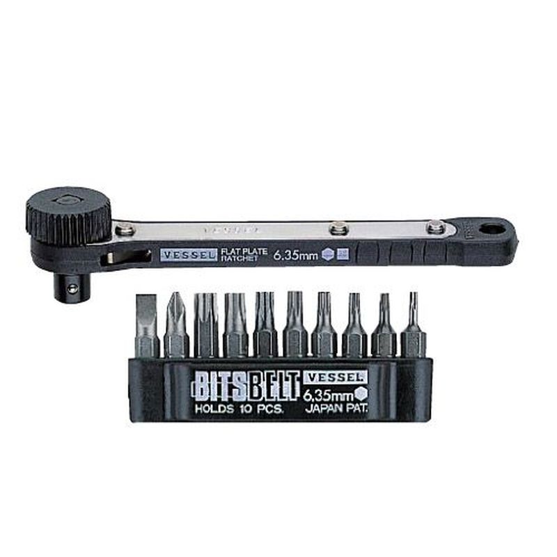 狭いところで便利な薄型ラチェットハンドル。 ボールロック式。六角対辺6.35mmのショートビットと四角穴対辺6.35mmのソケットが使用可能。