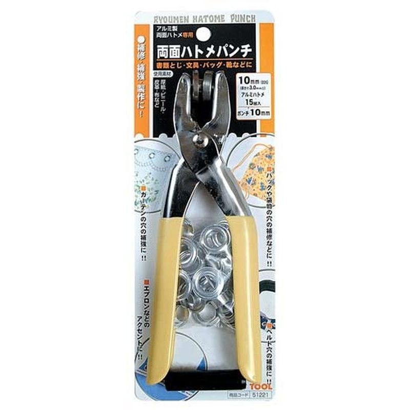 セット内容:両面ハトメパンチ本体×1個、アルミハトメ/10mm・#25×15組、ポンチ/10mm