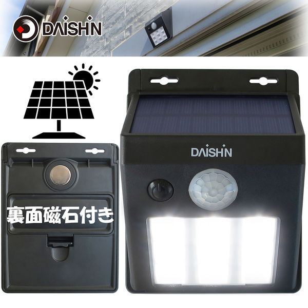 ウォールライト 屋外 ソーラー DAISHIN ダイシン ソーラーウォールライト DLS-WL001 120lm ルーメン 電源不要 太陽充電 センサー 人を感知 120度 4939736902103