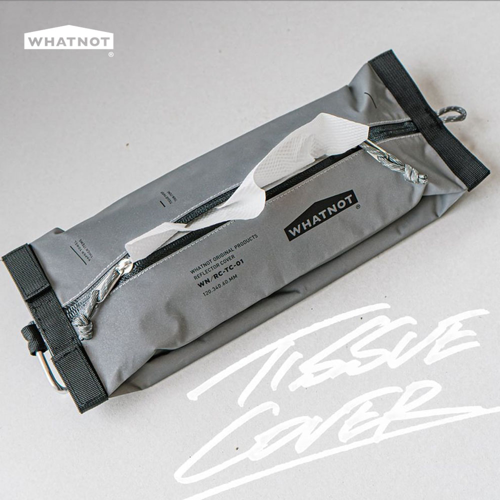 光を反射するリフレクター生地で作られたWHATNOTオリジナルのティッシュカバー。 ティッシュやキッチンペーパーの収納に便利で、付属のカラビナやループを活用すれば、屋内外問わずさまざまな場所に吊り下げて使用できます。