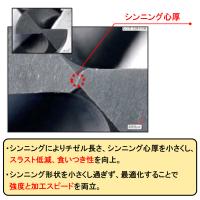 シンニングによりチゼルの長さ、シンニング心厚を小さくし、スラスト軽減、食いつき性を向上。シンニング形状を小さくし過ぎず、最適化することで強度と加工スピードを両立。