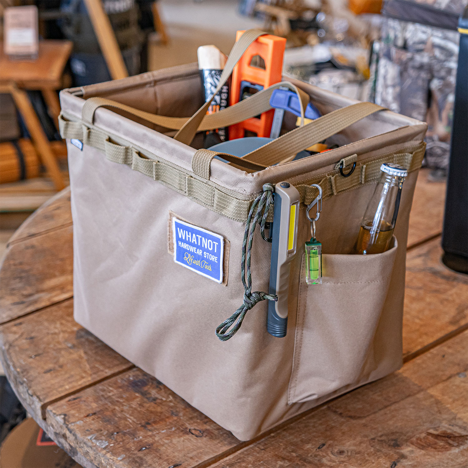 ・WHATNOTの代表的プロダクト、ワンタッチバケットのヘビーデューティー仕様。 ワンタッチバケットには、通常版と、フレームの太さが2倍(5mm)のヘビーデューティー仕様があり、こちらはヘビーデューティーの販売ページとなります。 工具・道具・部品の収納や運搬など、DIYからアウトドアまで幅広くご利用いただけます。 ▼仕様 ・展開時サイズ(約):幅360mm×奥行250mm×高さ320mm ・収納時サイズ(約):幅360mm×奥行250mm×高さ60mm ・重量(約): 1230g ・素材:【本体】ポリエステル、【ワイヤー】スチール、【底面】木・EPE、【足キャップ】PVC ※撮影写真上の付属の各種ツールは付属しておりません。 ※製品の仕様は予告無く変更する場合がございます。 | 商品名 |