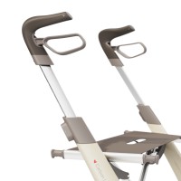 一般的な歩行器と逆向き、かつ進行方向に向けて緩やかに上昇する形状のハンドルは、握ったときの手首を自然な角度に保ち、上半身を起こして歩行器を身体に近付け、正しく歩行するための姿勢を自然に生み出します。