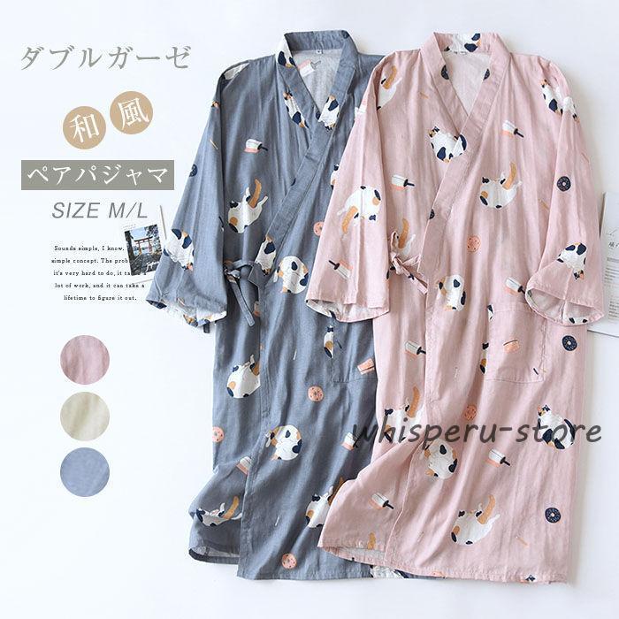 ダブルガーゼ パジャマ 浴衣 バスローブ ペアパジャマ レディース メンズ 春 夏 七分袖 ルームワンピース 寝巻き 綿100% 甚平 浴衣 猫柄 和風パジャマ カップル