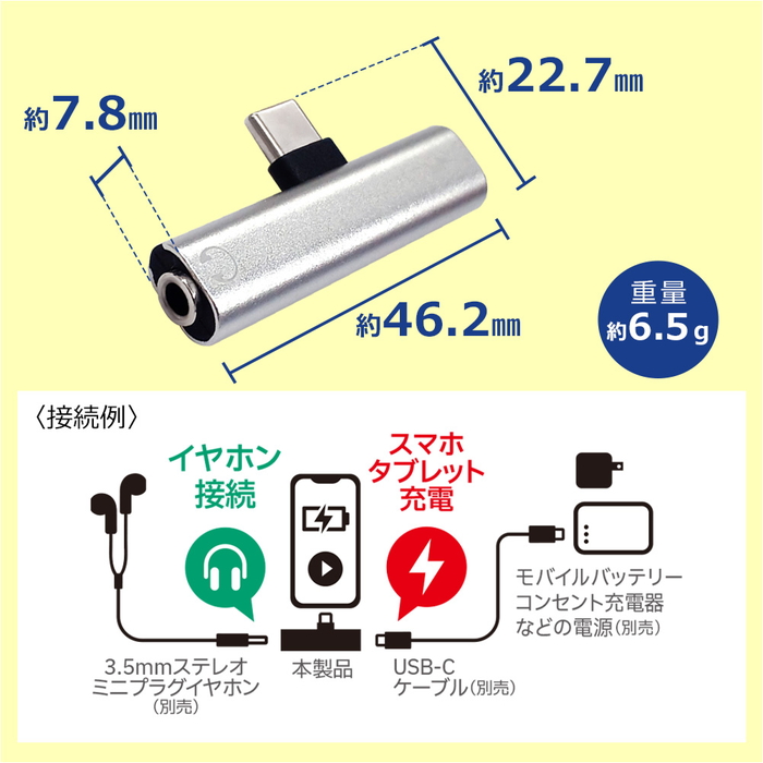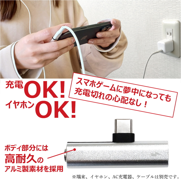お手持ちの3.5mmステレオミニプラグ有線イヤホンを接続し 、同時にType-Cポートからスマートフォンやタブレットを充電できる便利な変換コネクターです。