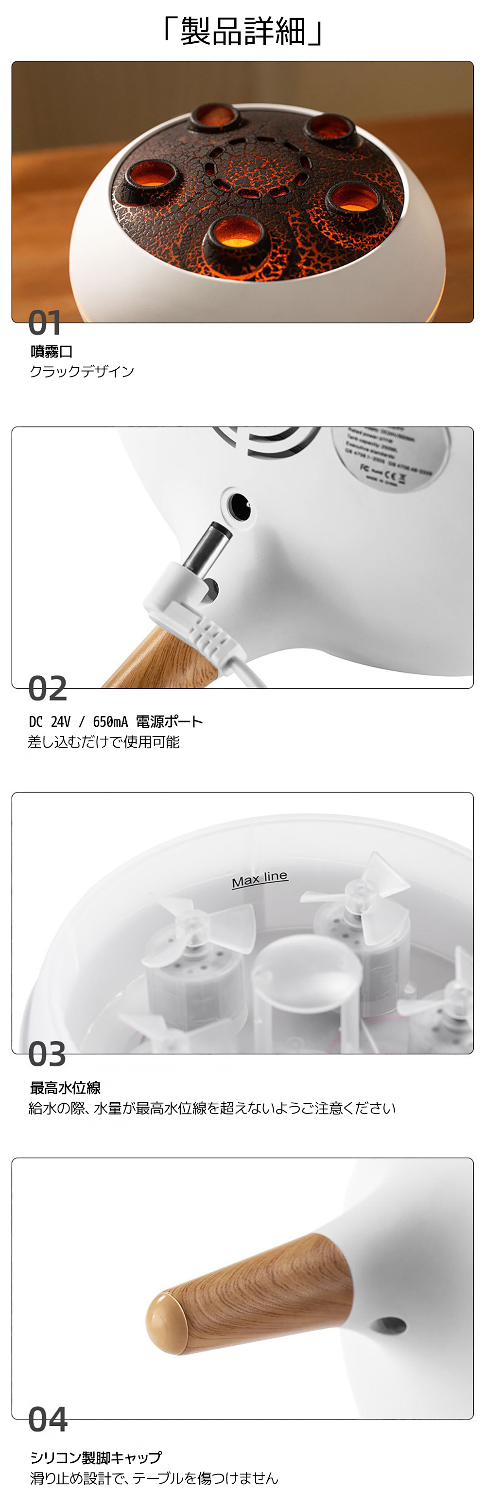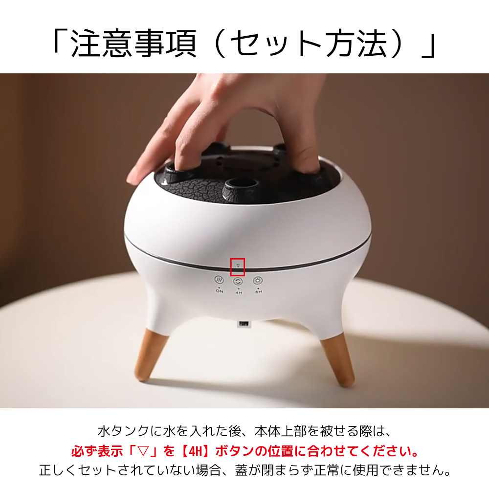 製品使用時 注意事項 | ・ 本製品はコードレス製品ではなく、有線・コード式タイプです。バッテリー切れを気にせず、安定した動作を長時間ご利用いただけるのが有線のメリットです。 ・ 本製品をご使用の際は、必ず 水溶性の植物性アロマオイル をご使用ください。 ※それ以外のオイル(精油100%、油脂系、可燃性・合成香料を含むもの 等)は使用しないでください。 ・不適切なオイルを使用すると、本体内部の故障や劣化の原因となります。 ・ 加湿器を使用する際は、安定した場所でご使用ください。 ・ 稼働中にカバーを開けて水やアロマオイルを追加しないでください。 ・ 水が少ない際は稼働せず、補充してから稼働してください。 ・ 使用後はカビや細菌の繁殖を防ぐため、 必ず残りの水を捨て拭き取った状態で保管してください。 ・ 小さなお子様の手の届かないところで使用保管してください。 ・ 輸入品のため、小キズやスレなどがある場合が御座いますので、予めご了承下さい。