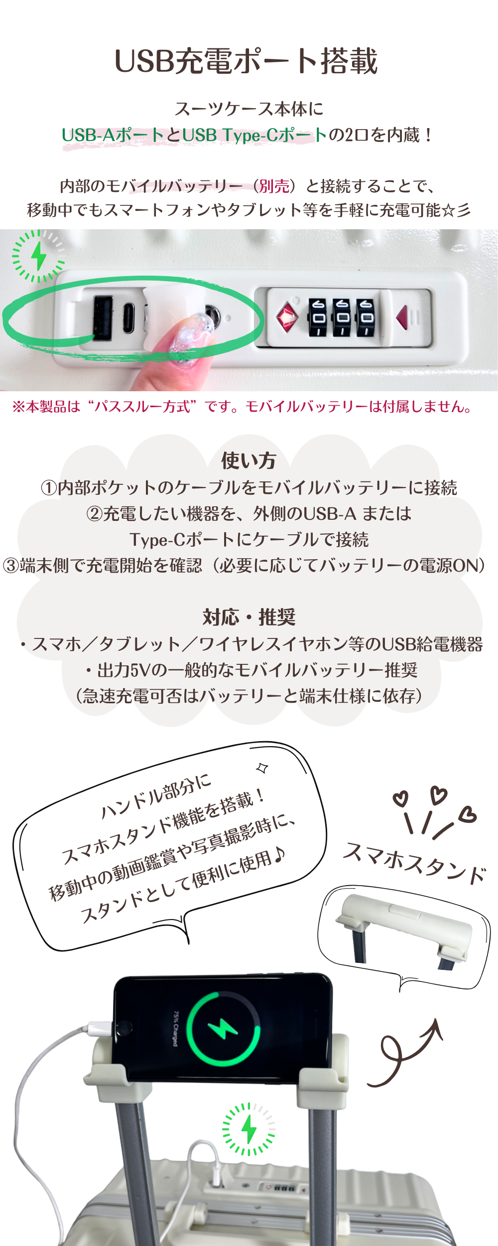 | (2) USB充電ポート | スーツケース本体にUSB-AポートとUSB Type-Cポートの2口を内蔵。 内部のモバイルバッテリー(別売)と接続することで、 移動中でもスマートフォンやタブレットを手軽に充電可能。 ※本製品はパススルー方式。モバイルバッテリーは付属していません。 |
