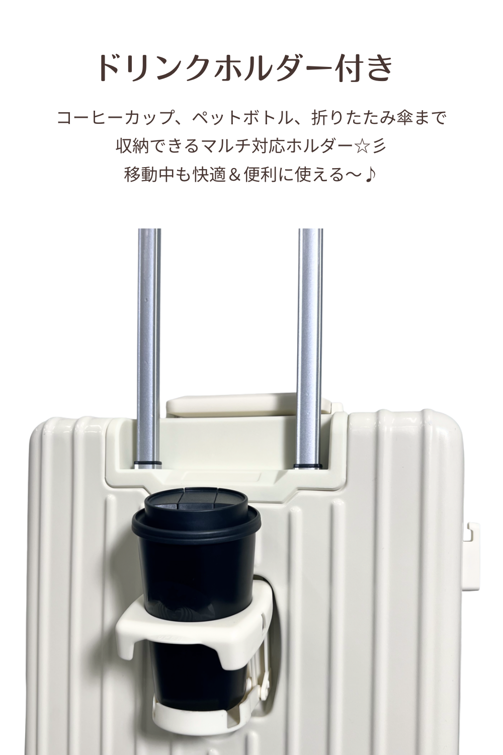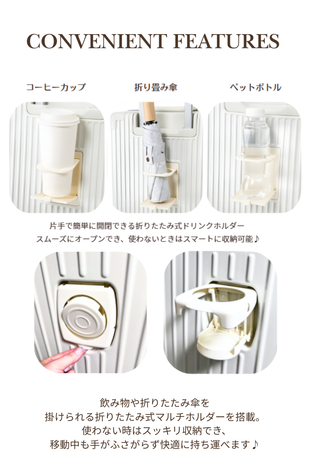 | (3) カップ&ドリンクホルダー | 折りたたみ式のマルチホルダーを搭載。 ペットボトルやコーヒーカップ、折りたたみ傘を掛けられ、使わないときはスッキリ収納。 移動中も手がふさがらず快適に持ち運べます。 |