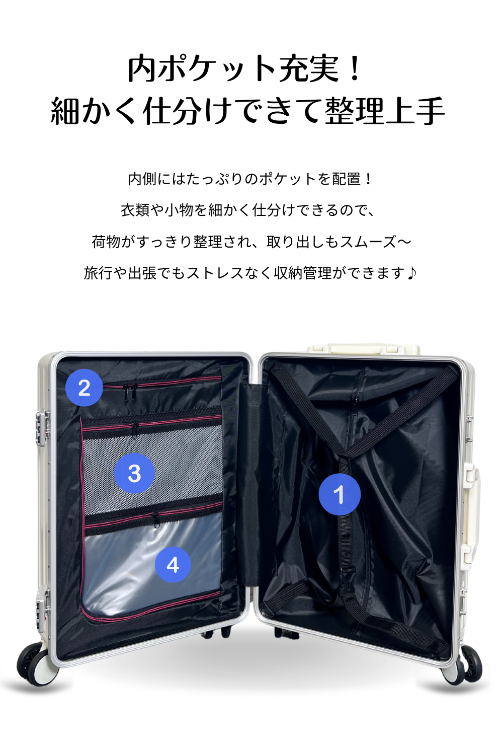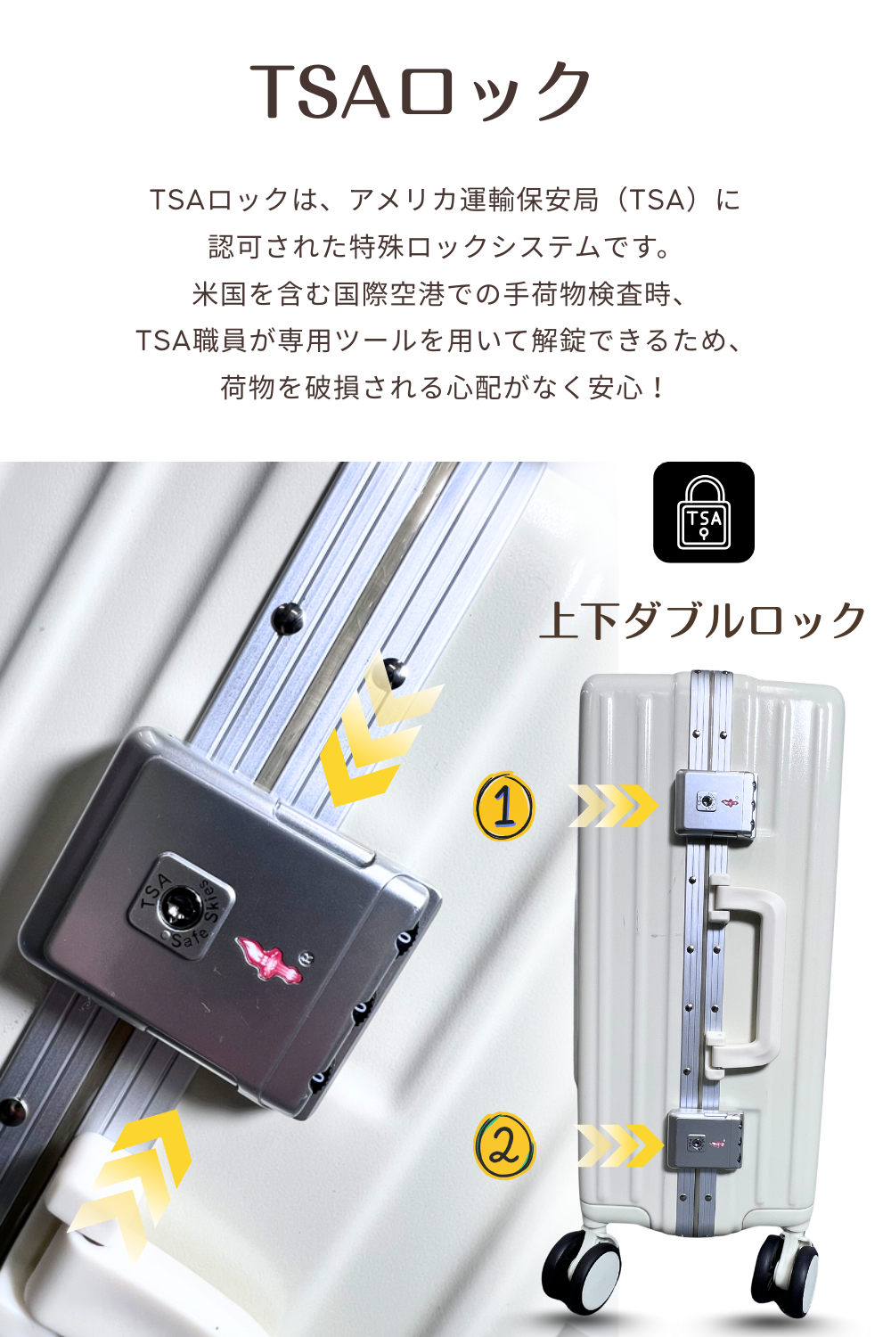 | (4) TSAロック | 安心のTSAロックを搭載。 海外空港での検査にも対応し、鍵を壊される心配なく荷物を預けられます。 旅行中のセキュリティも万全です。 |