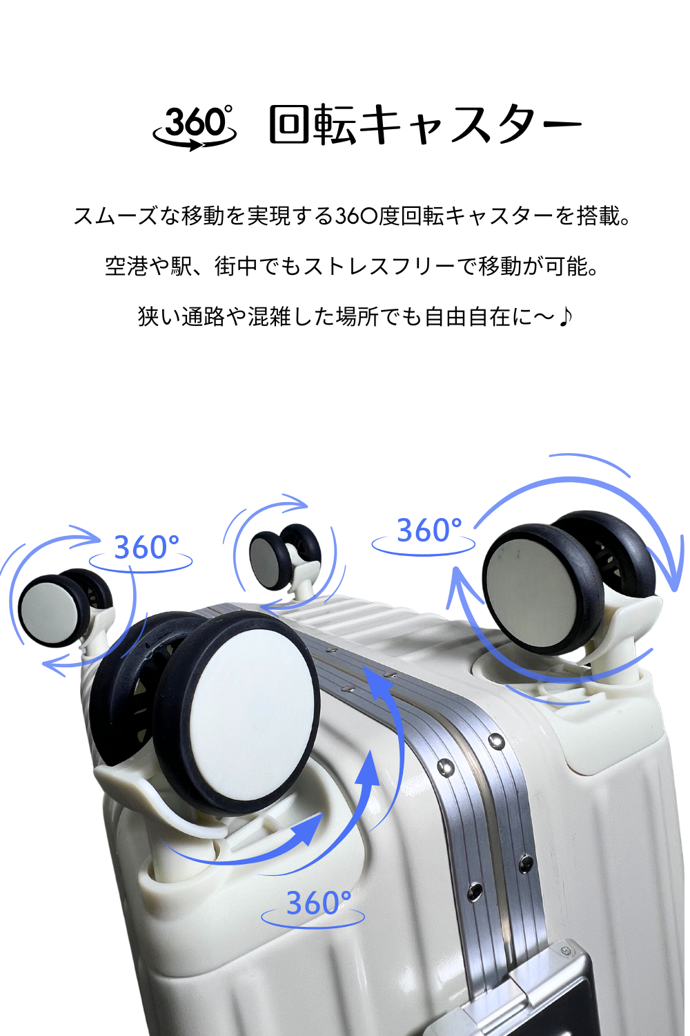 | (8) 360°回転キャスター | 静音仕様の360°回転キャスターを搭載。 空港や駅でもスムーズに動かせ、狭い通路でも快適に走行できます。 |