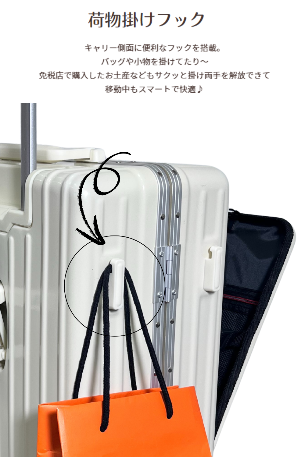 | (6) 荷物かけフック | 免税店で買ったお土産や小さなバッグもサッと掛けられる便利フック付き。 両手を自由にしてスマートに移動できます。 |