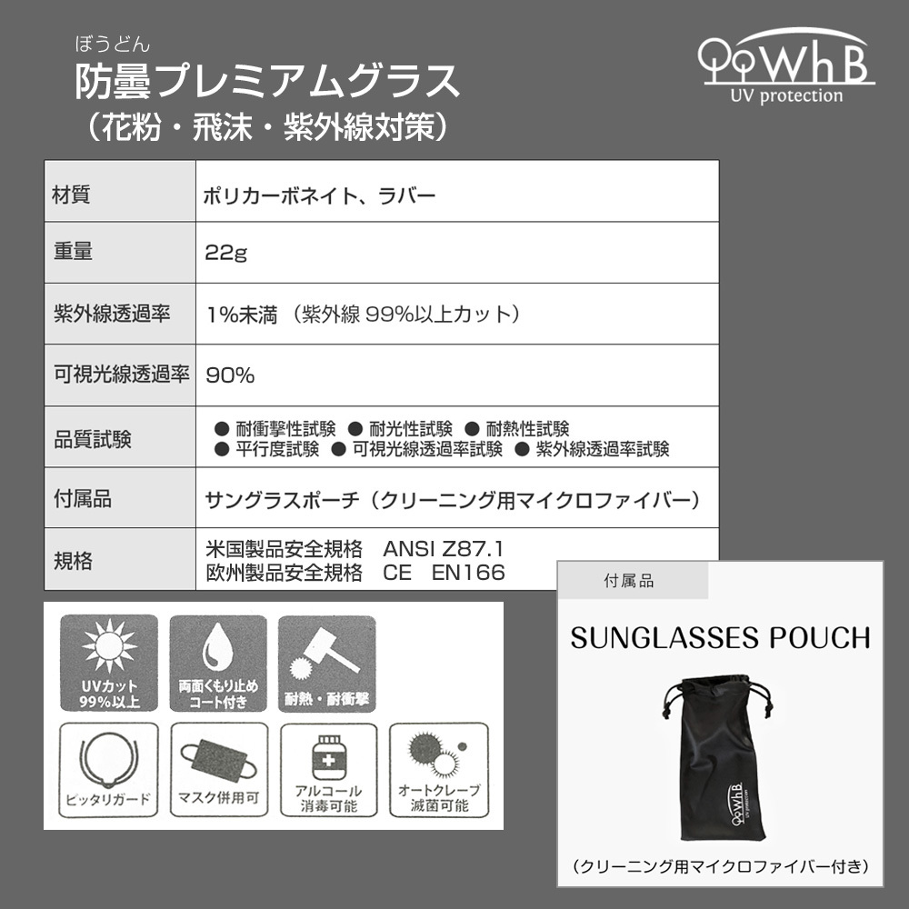 防曇サングラスプレミアム(ケース付) 飛沫対策グラス 花粉対策 UV対策メガネ メガネ 保護メガネ 曇らない ホワイトビューティー アイケアグラス WhB