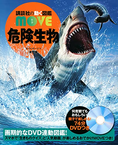 3歳から楽しめる! こどもが熱中する図鑑『MOVE』シリーズ。 シリーズ内でも大人気タイトル「危険生物」が新訂版としてリニューアル! 図鑑もDVDもパワーアップして最強の「危険生物」図鑑に! 危険生物が、動く! 飛ぶ! 走る! 毒やつめやきばを使って、必死に生きている危険な生きものたちの リアルな生態、ふしぎな魅力がこの一冊に詰まっています。 肉食獣やサメはもちろん、毒ヘビ、毒ガエル、ワニ、怪魚、猛禽類…etc。 MOVEでは、選りすぐりの危険生物を、 躍動感のある写真と大迫力のイラストで詳しく紹介しています。 調べるときに使う図鑑としてだけでなく、 各所にこどもたちの知的好奇心を刺激する工夫がたくさん。 読むたびに、見るごとに、驚きと発見がある、ワクワクする内容です。 また、危険生物を単に恐ろしい存在としてみるだけでなく、 地球上の生物多様性を支える一員として、見直して欲しいという 監修者、編集部の思いも込められています。 もちろん新訂版もNHKのスペシャル映像DVDつき! 危険なチンパンジーやミツクリザメの捕食映像など、 NHKのアーカイブから、必死に生きる生きものたちの