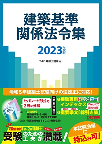 【圧倒的な使いやすさを「セパレート形式・2色刷り」で実現! 建築士受験にベストな法令集】 本書は、一級・二級建築士試験受験生のために、読みやすさ・使いやすさを特に重視して編集した、試験会場に持込み可能な「建築基準関係法令集」です。 引きやすく、持ち歩きに圧倒的に便利な分冊形式で、そのままでも、分解しても使えます! 受験に役立つ94法令を厳選収録。主要法令は見やすい2色刷り、使い勝手の良さは圧巻です。是非体感してください! ★フルカラー特製インデックス付き!★ ★令和5年試験向けの法令に対応! 【本書の特長】 ・ありそうでなかった法令集! 1冊でも、2冊に分解しても使える「セパレート形式」を採用しました。 参照頻度が最も高い建築基準法等を上巻に、その他関連法規を下巻に収録。法令の引きやすさは抜群です。 ・「一級・二級建築士試験」の試験会場に持ち込んで使用できます。 ・上巻の「建築基準法・令・規則」「建築士法」は2色刷り、かつ、全文掲載。大きい表示の条文タイトルでとっても見やすい! ・収録法令を、関連分野ごとの並び順としました。探す法令の”アタリ”がつけやすく、素早く検索できます。