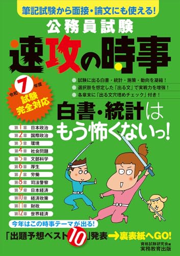 累計200万部超のベストセラー! 速攻の時事シリーズはもはや全公務員試験受験生必携といっても過言ではない超定番の時事問題対策本です! 『速攻の時事』は、単に最近のニュースを集めただけの時事用語集ではありません。 数々の白書・政府刊行物、公的な統計、官公庁の施策、政治・経済の動向など実際に公務員試験に出ている最新情報を徹底的にチェックし、ポイントをギュッと凝縮して簡潔な文章でまとめた唯一無二の公務員試験向け時事テキストです。 本書は、教養試験(基礎能力試験)の時事や、政治経済・社会、専門試験の政治学、行政学、国際関係、社会政策、経済学、財政学などあらゆる科目に対応しています。 また、論文試験・作文試験、面接・集団討論などでも、時事の知識は大いに役立ちます。 これに加えて、姉妹版の『公務員試験 速攻の時事 実戦トレーニング編』で問題演習をすれば、鬼に金棒です。