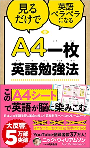 【大反響 5万部突破 いま一番売れている英語勉強法の本】 YouTubeチャンネル登録者数37万人 大人気英会話講師「ニック式英会話」のニック・ウィリアムソンの最新刊。 20年間日本人に英語を教えながら、認知神経科学の研究をベースに改善し続けた、英語が脳に染み込んでしまう「魔法のA4シート」を初公開 このシートを見てしゃべっていくだけで、ネイティブに伝わるフレーズがラクに身につく パッと口から出てくるようになる 【日本人のつまずきポイントを解消する、魔法の「A4一枚」のすごいメカニズム】 (1) 伝わる英語がすぐ言える超簡単な「フレームワーク」 →英文の構成要素をたった4つのパーツに整理整頓。4グループの単語を順番に見てしゃべっていくだけで、ネイティブに絶対伝わる自然な表現が作れてしまう。 (2) 英単語の吸収スピードも上がる →あらゆる英単語が、このシートにあてはめるだけで覚えられる。自分でつくったフレーズに英単語を組み込めるから、吸収スピードも段違い。もう例文暗記とはオサラバ (3) 英文法は「文法用語ナシ」で直感理解 →文法の知識がなくても、シート上で日常会話のさまざ