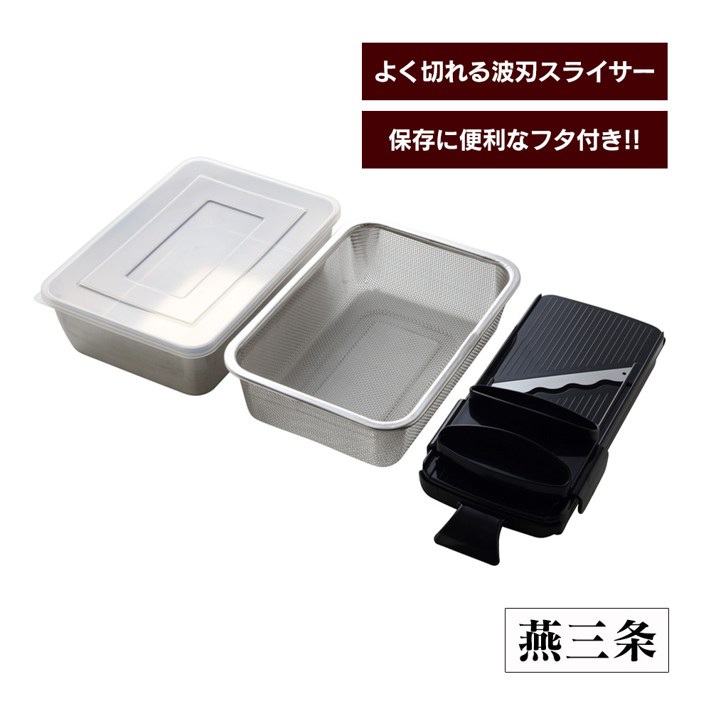 バット スライサー セット 波刃 料理 ステンレスバット セット 蓋付き 燕三条 コンパクト 網 深型 角型 四角 角バット ザル ざる 野菜 水切り 耐久性 耐熱性