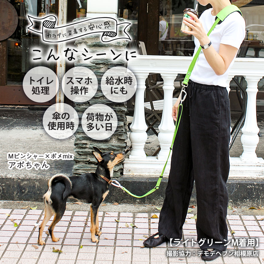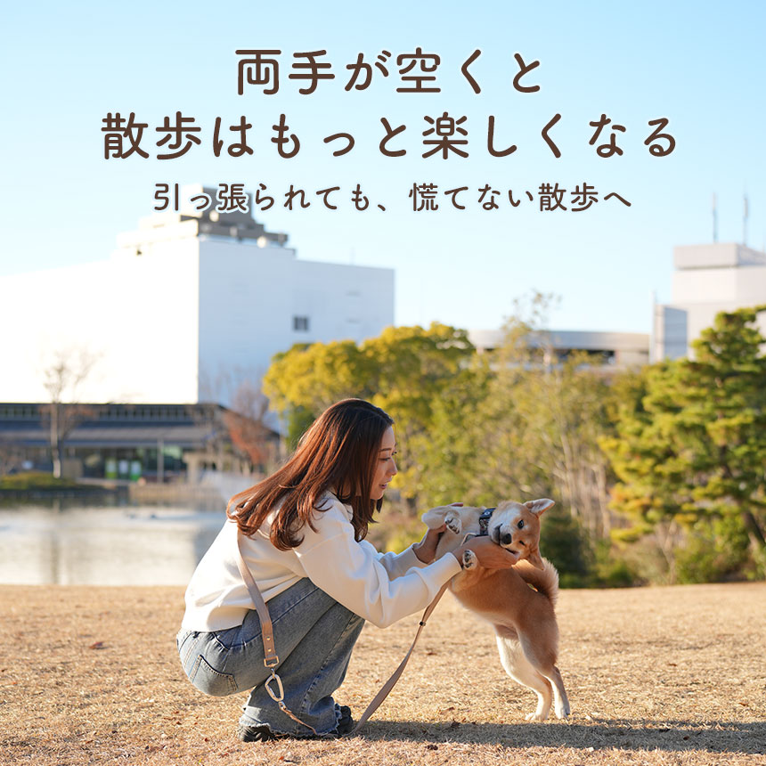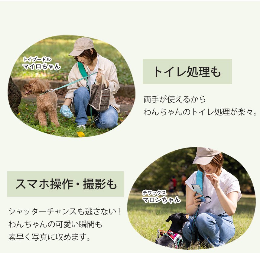 ショルダーベルトとリードをつなげることで、両手が自由になります。両手がふさがって一苦労だったトイレ処理も楽々!可愛いわが子の写真も撮影しやすい!お水、おやつ、鍵やスマホなどの取り出しもササっとできます。飼い主さんが両手を離して作業していても、わんちゃんが側にいる安心感があります。