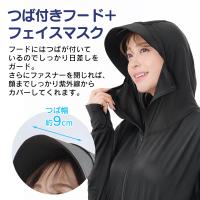 ファスナーを閉じると鼻まですっぽり包み込み、顔・首元から上半身までしっかり紫外線から守ります。また袖は親指が出せる指出し穴付きデザインで、気になる手の甲もガード!
