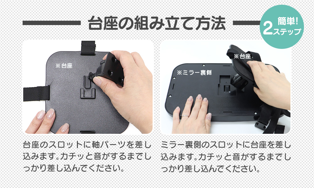 ミラー台座はパーツを差し込む・スライドさせるの2ステップで完了。