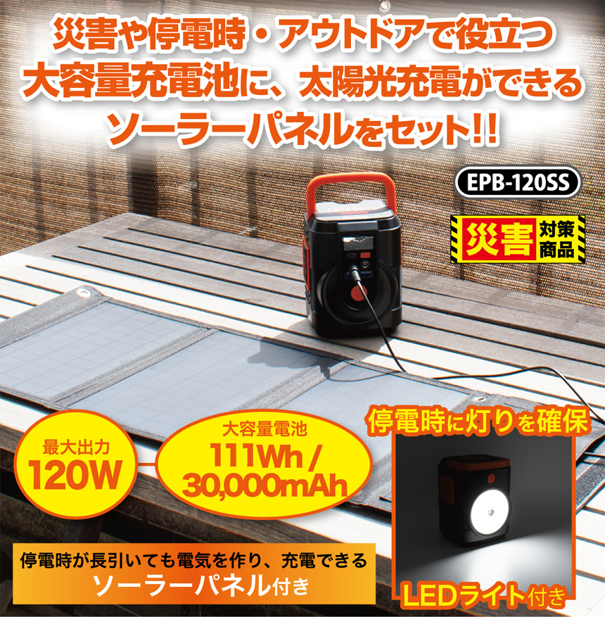 30000mAh大容量バッテリー搭載のコンパクトなポータブル電源にソーラーパネルをセット●大容量リチウムイオン充電池内蔵