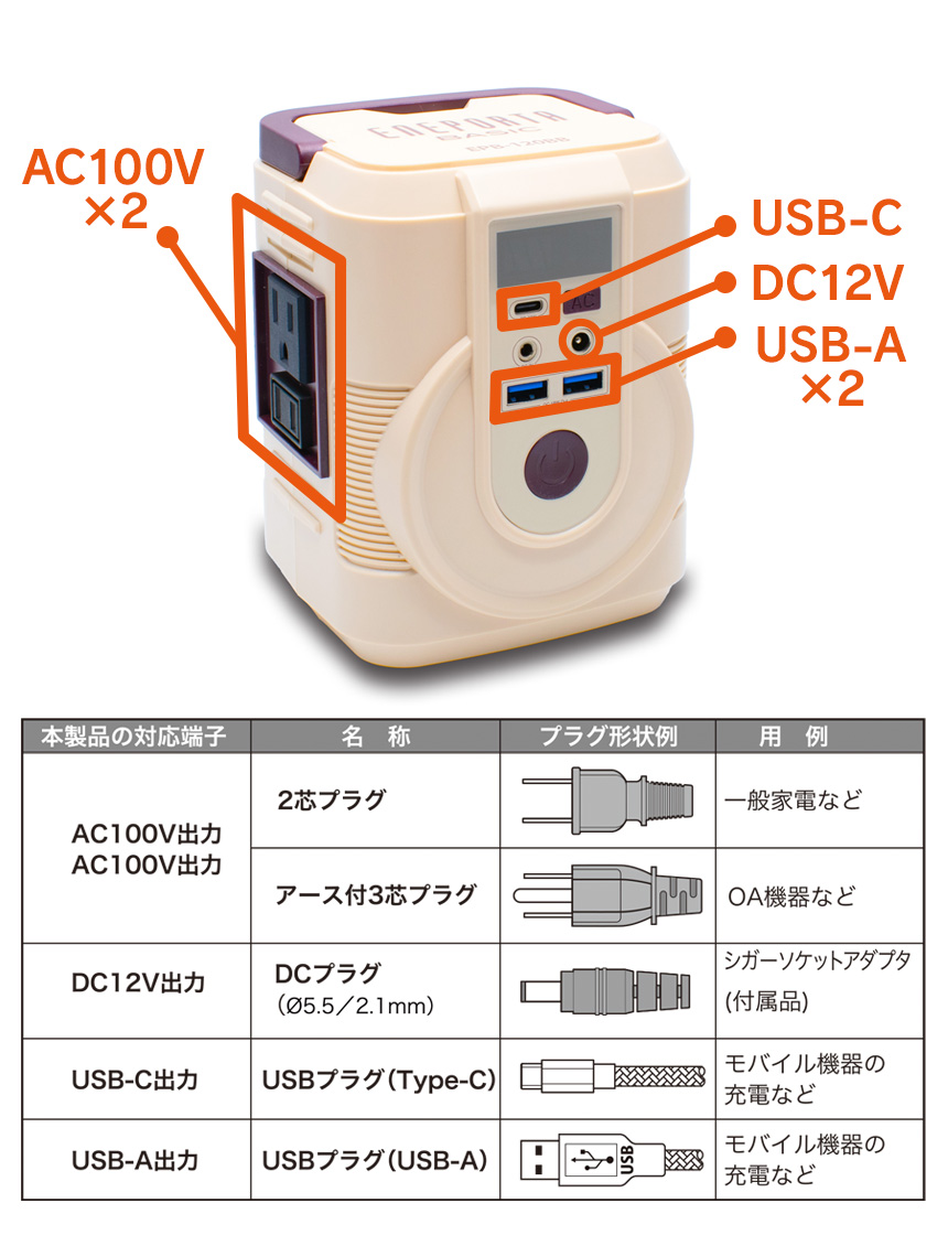 AC:アース付き3芯/2芯・2芯 ※消費電力120Wまでの機器をご使用いただけます。