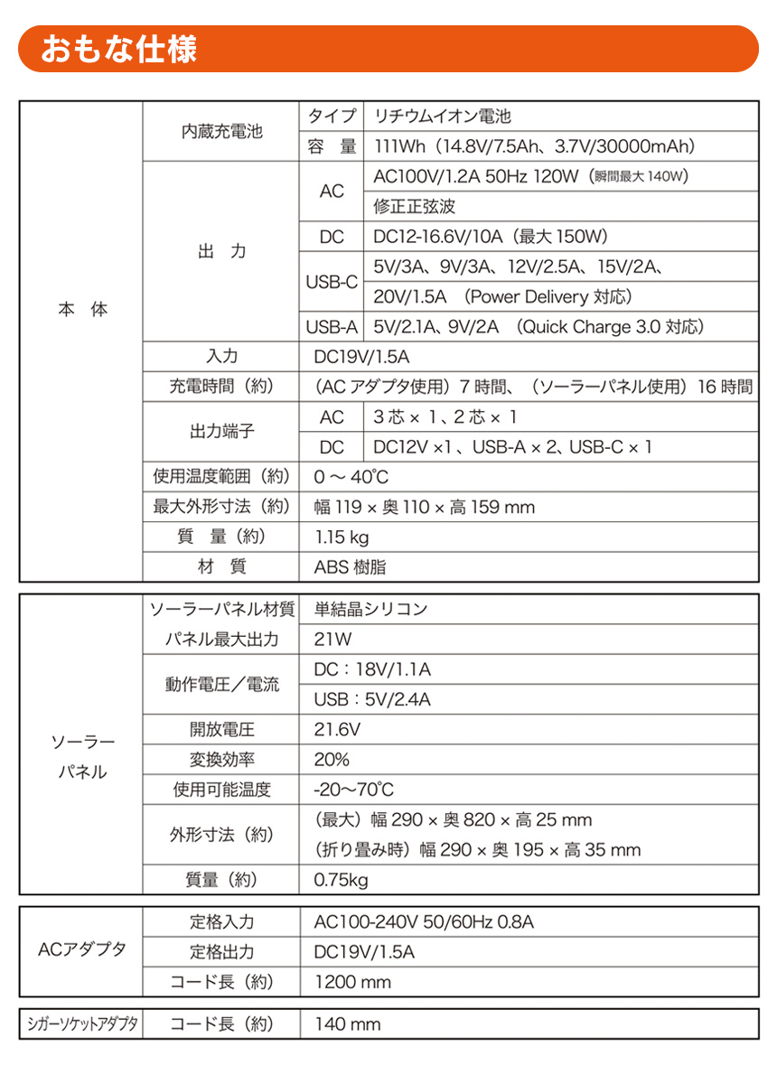 充電時間(約)ACアダプタ使用/7時間、ソーラーパネル使用/16時間 ※理論値