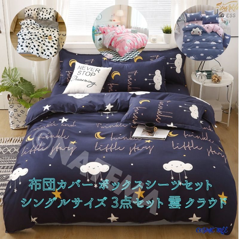 | サイズ・素材 | :シーツ=160X220cm 布団カバー=150X200cm 枕カバー(1枚)=40X70cm ※1〜3cm誤差がある場合がございます。 【材質】 ポリエステル、コットン |