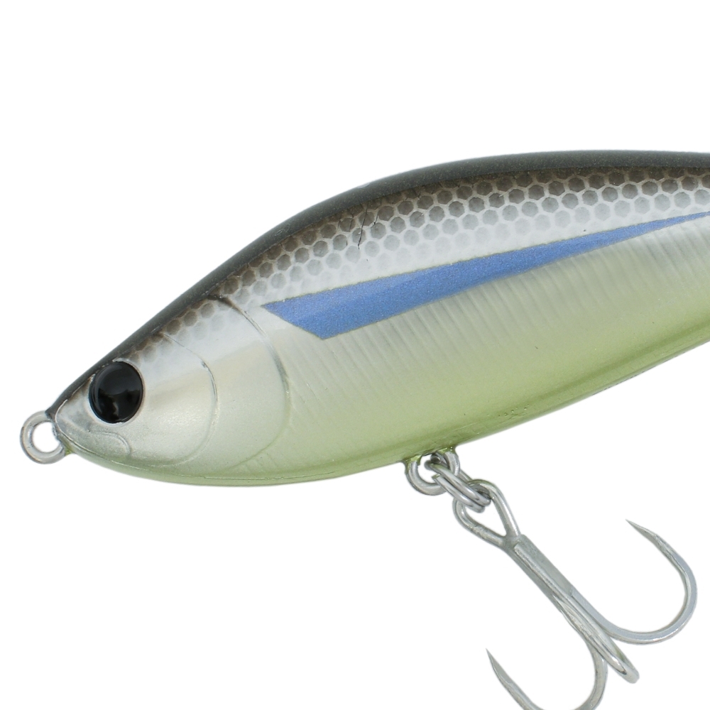 ワカサギのパープルバンドとボラの青い胸鰭をイメージしたブルーパープルのトライアングルサイドバンドが特徴。 サイドのシルバーはボディ側面を遠方に向けアピール。 下や後ろからチェイスされた時は、ロールしながら左右にスラロームするアクションで、チラチラとキラメキを見せます。 黄味がかったベリーはローライト時も目立ちすぎず、埋もれない存在感を確保。 テール下部にはグローが入っており、朝夕夜にはバイトトリガーとしてアピールします。