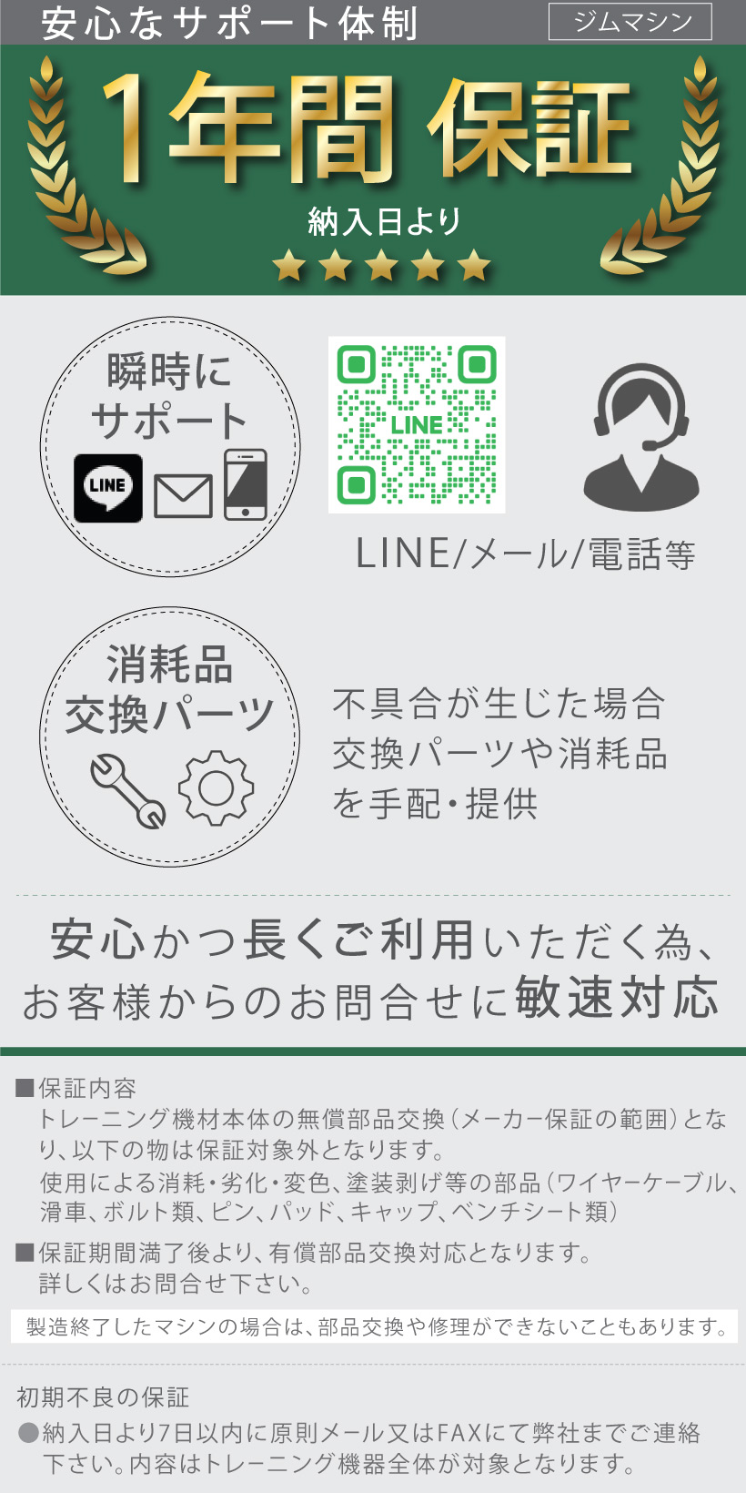 | 1.機材本体の保証期間は納品日より一年とします。ただし送料はお客様ご負担となります。 2.使用による消耗、劣化、変色等及びケーブル・滑車・ピン・パッド・シート等は保証の対象外です。 3.期間終了後は有償での交換となります。 ただし、製造終了したマシンの場合は、部品交換や修理ができない場合もございます。 ※初期不良および欠品、故障等があった場合、部品の在庫がありましたら2〜3日ほどでお届けいたします。在庫のない場合は取り寄せとなりますので多少お待ちいただきます。予めご了承ください。 |