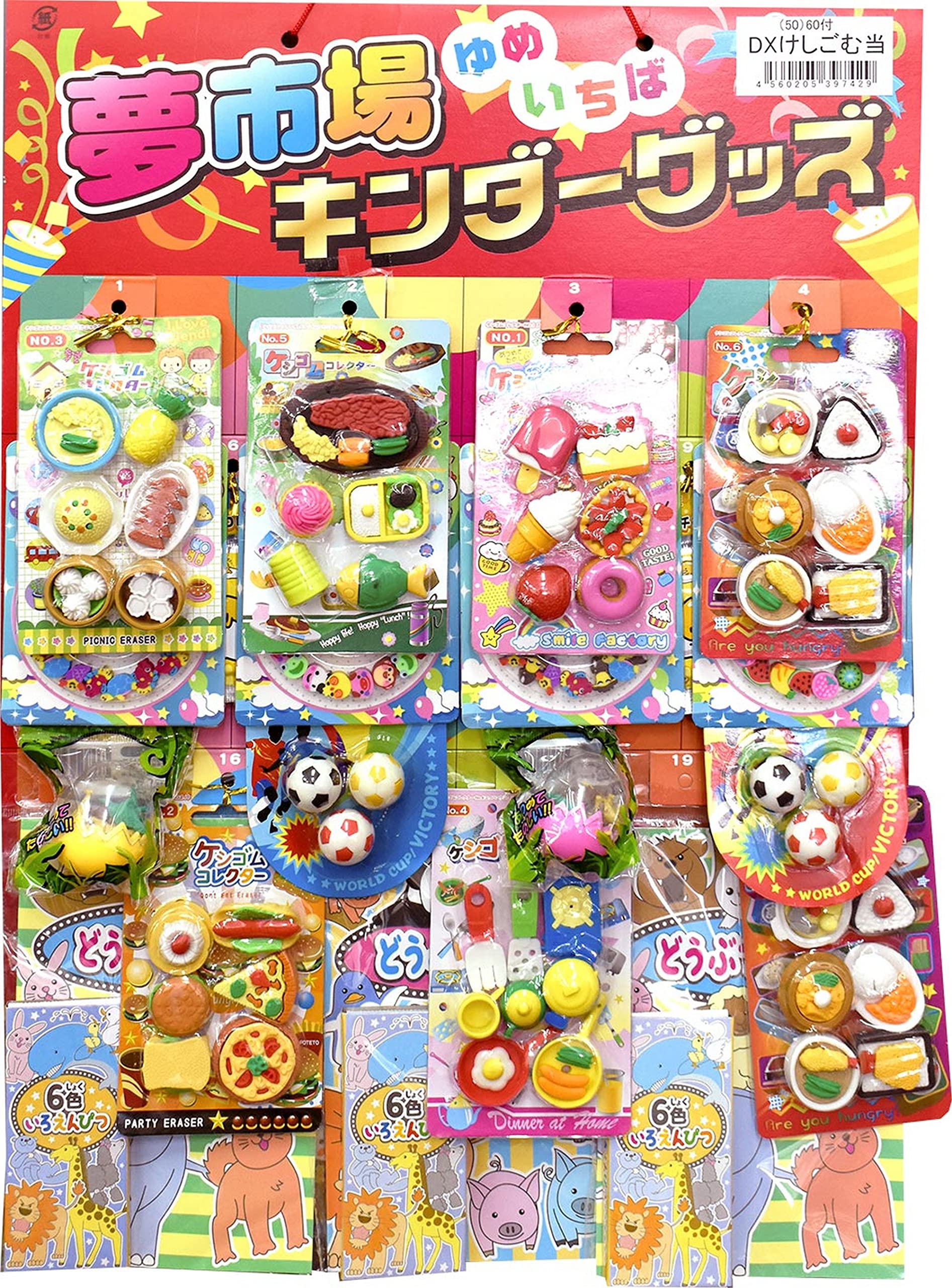 商品名:夢市場 キンダーグッズ DXけしごむ当(60付) クジ引き つりさげタイプ ハズレなし 抽選箱付