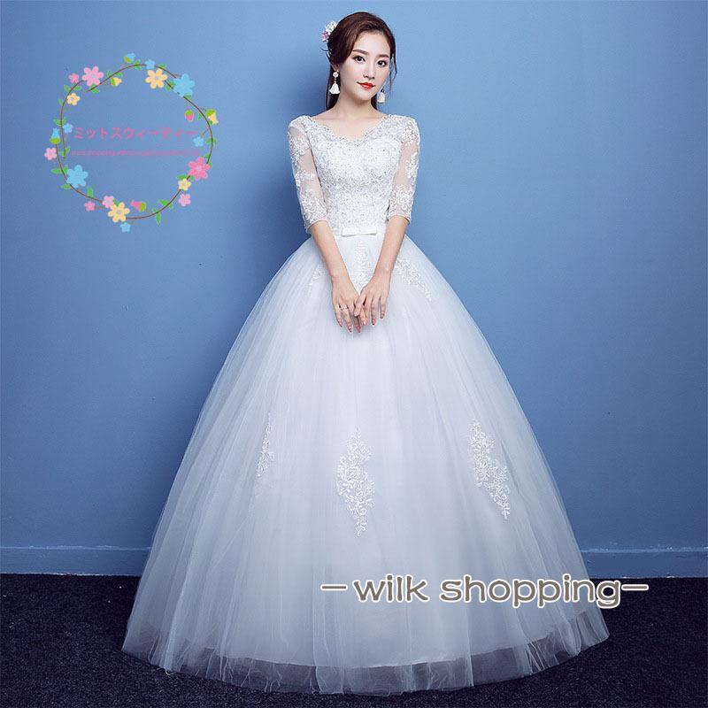 ウェディングドレス プリンセスライン レース 結婚式 花嫁 ロングドレス ブライダル 二次会 パーティードレス 披露宴 袖あり 大きいサイズ おしゃれ