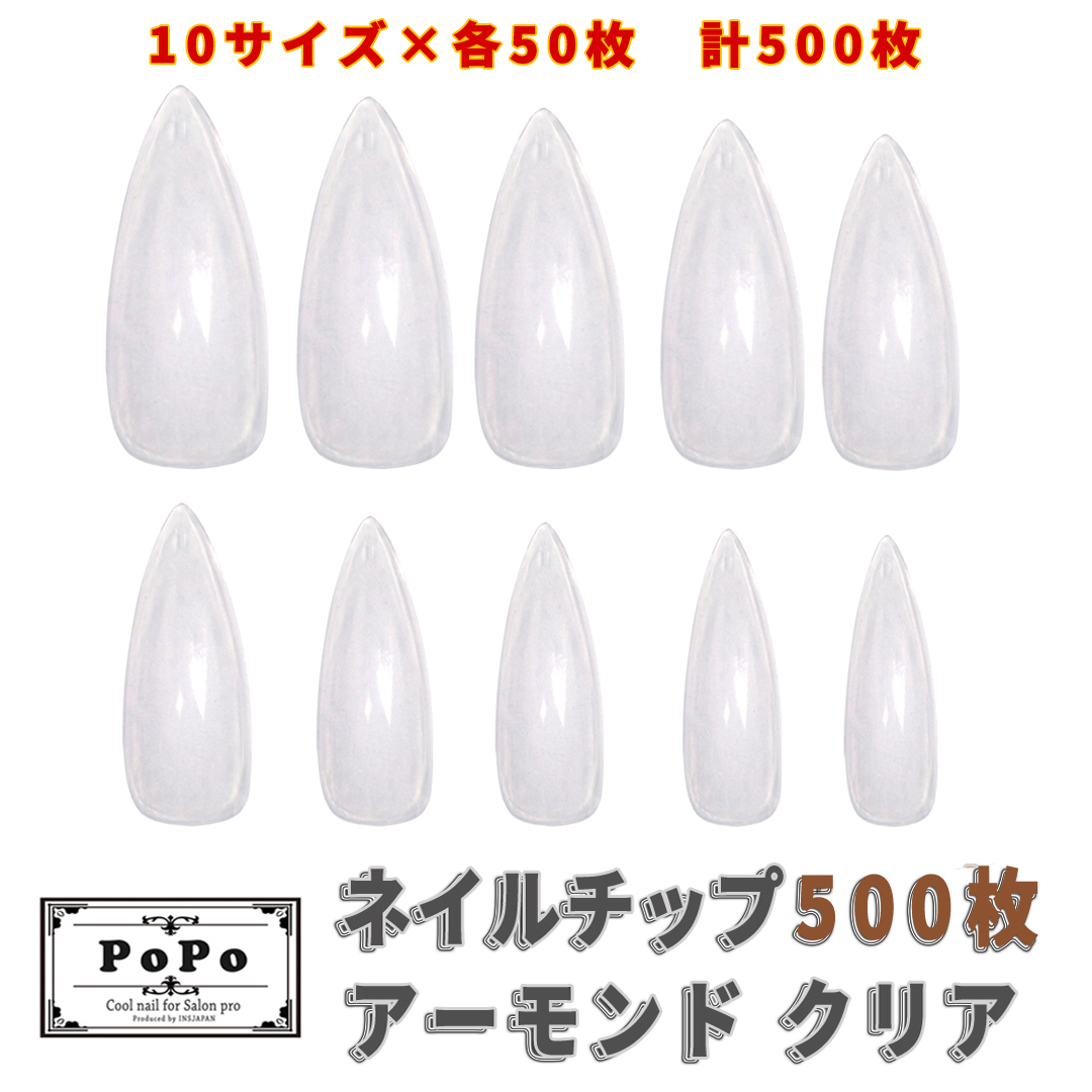 ネイルチップ アーモンド クリア 500枚セット (10サイズ×各50枚) 透明 付け爪 ネイルアート ジェル ネイル 練習 オーバル