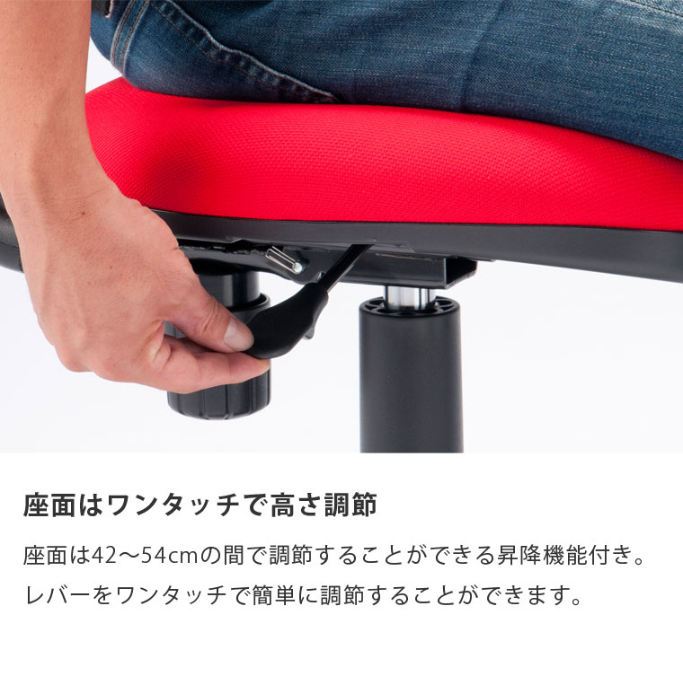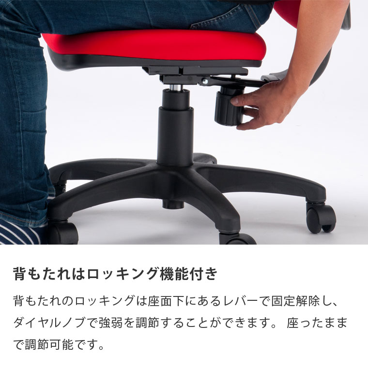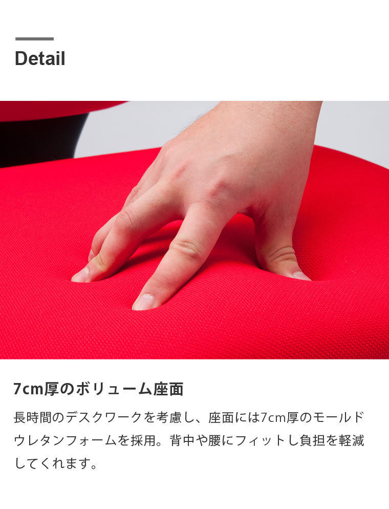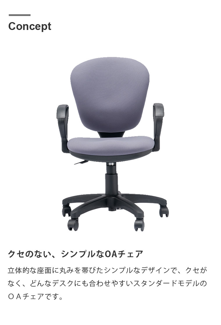 【こちらは肘掛け付きでの販売ページになります。】 クセのない、合わせやすいシンプルなスタンダードモデルのOAチェア。 長時間のデスクワークを考慮し、7cm厚のボリューム座面には耐久性に優れたモールドウレタンフォームを採用しました。 モールドウレタンは車のシートなどにも採用されている復元性が非常に高いクッション材です。 一般的なスラブウレタンやチップウレタンは、密度によってボリュームは出せますが、徐々に劣化していきます。 モールドウレタンは型崩れしにくいためへたりが遅く、低反発ウレタンよりも湿度や寒さに強いのが特徴です。 立体的な座面に丸みを帯びたデザインで、背中や腰の負担を軽減するフィット感を重視しました。 昇降機能はレバーをワンタッチで体格に合わせた12cmのストロークの調整が可能です。 ロッキング機能はレバーで固定解除、ダイヤルノブで硬さの強弱が座ったまま調整可能です。 肘掛けは取り外して使用することもできます。 |