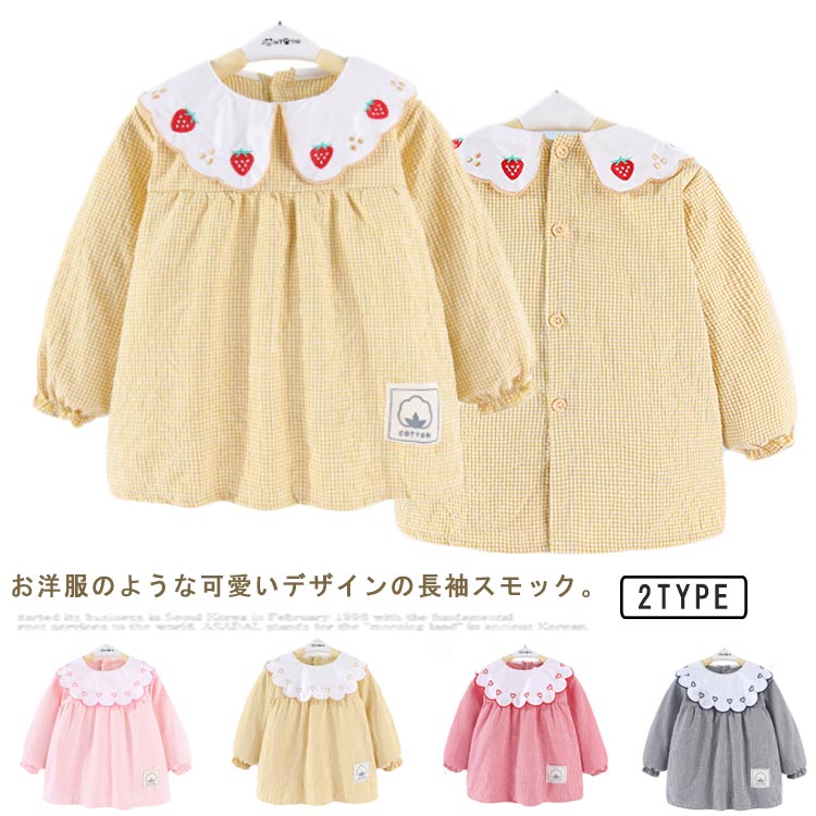 | お洋服のような可愛いデザインの長袖スモック。 外出時恥ずかしくないおしゃれにスモックを着用できます。 長袖タイプなので、お洋服はいつでも清潔にいられる。 裏起は防水加工で、お食事など時もお洋服を汚せず安心。 すっぽり被るだけで可愛く汚れ防止◎ お家はもちろん、幼稚園や保育園でも大活躍に間違いなしです。 | |