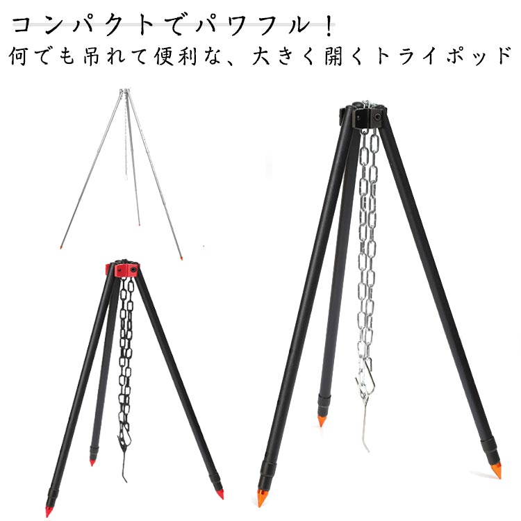 ?コンパクトでパワフル!何でも吊れて便利な、大きく開くトライポッド ?ハイ?ローの高さ切り替えでソロから大人数まで楽しめる ?料理の火力調整や、ランタンを高い位置に吊るすときにも便利です。 ?チェーンの高さは無段階調整ができるため、火力を加減しながら調理ができます。 ?吊り下げ位置も自在チェーンで簡単に変えられて手軽です。 ?分解してコンパクトに収納できる | |