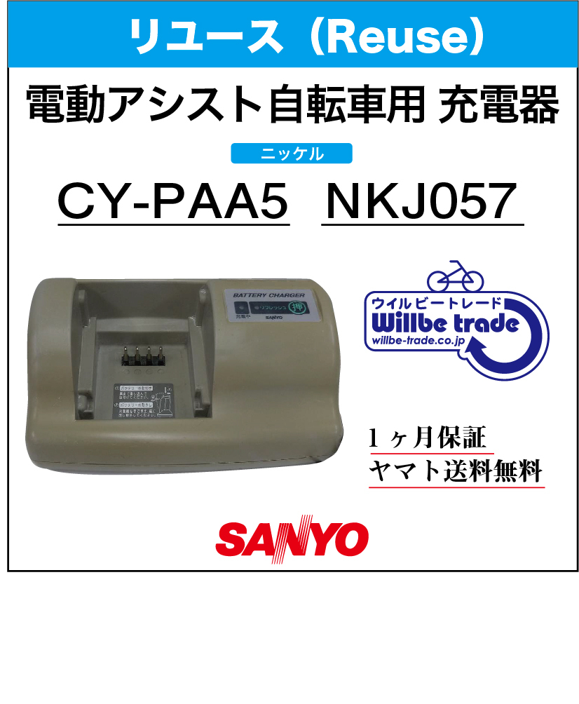 SANYO CY-PAA5 (Panasonicの新型番NKJ054)充電器を即納させていただきます。バッテリーの充電器が壊れた方、直ぐにお届けできますよ。当社にて整備しきれいに洗浄した商品を3日以内でお届けが出来るかと思います。お届けする充電器はご利用になられているバッテリーは、CY-LA40,CY-EB60,CY-EB80,NKY386B02,NKY378B02と互換性がございます。 ご不明な事、何なりとお問い合わせください♪バッテリーの性能判断させて頂きます。『電動自転車バッテリー再生・修理専門店』株式会社ウイルビートレードコーポレーション 横田 電話:03-6321-0104営業 月曜-土曜日 10:00-18:00