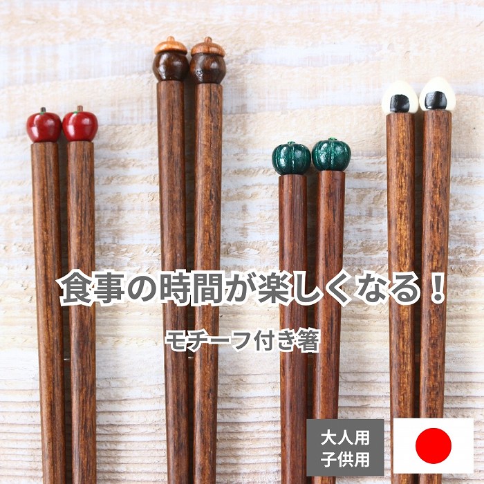 | 揃えたくなる可愛さ! 癒しを届ける立体モチーフ箸 ご飯の時間がなんだか楽しくなるお箸です。 小さなモチーフでもインパクトが有りとっても可愛いです。 サイズは大人用と子供用の2種類。 親子で家族で楽しいお食事の時間が過ごせそうです。 可愛らしいデザインながら、ナチュラルテイストに仕上がっているので、大人の方でも違和感なくお使いいただけます。 またキャラクターを卒業したい年頃のお子様にも、ちょうどピッタリのお箸です。 料理が掴みやすいよう先角加工が施され、使いやすさにもしっかりと配慮がされております。 天然木の質感と優しさ、温もりを感じるナチュラルなお箸です。 デザインはおにぎり、どんぐり、りんご、かぼちゃの4種、それぞれ大人用、子供用の2サイズ  |