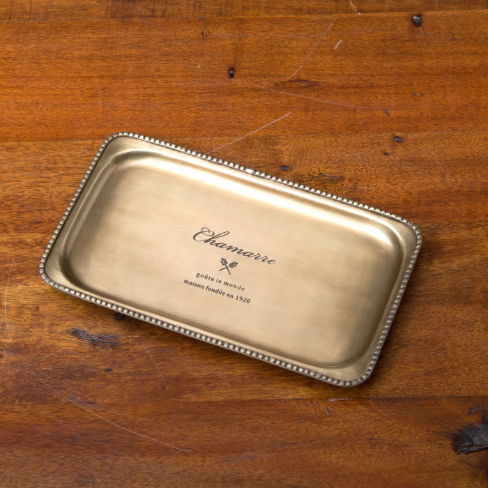 | 燻したようなアンティークゴールドがカッコいいレクタングルトレーです。 長年使われてきたようなアンティークな風合いに味わいが感じられます。 いつも使うアクセサリーや鍵、時計等を置くのにピッタリなサイズのトレイです。洗面所やキッチン、玄関等に置いておくととても便利!またデスク周りではペンや文具などの収納にもお使いいtだけます。 アンティークゴールドが海外のホテルやショップの様なお洒落な雰囲気に! |