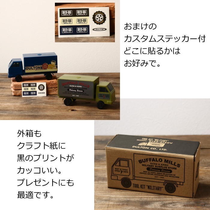 | Tool kit "delivary & millitary" 小さいけれど、本格派の工具セット ディスプレイにもなるカッコよさ。 ミニカーの様に見えますが、 充実のセット内容。 リビング等においても まさか工具だとは思いません。 使いやすい場所に違和感なく ディスプレイ感覚で置けちゃうのが いいとこです。 |