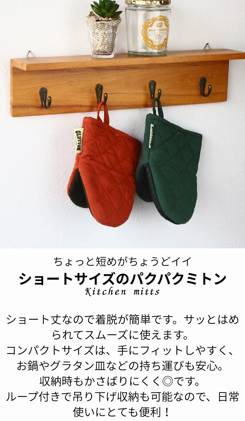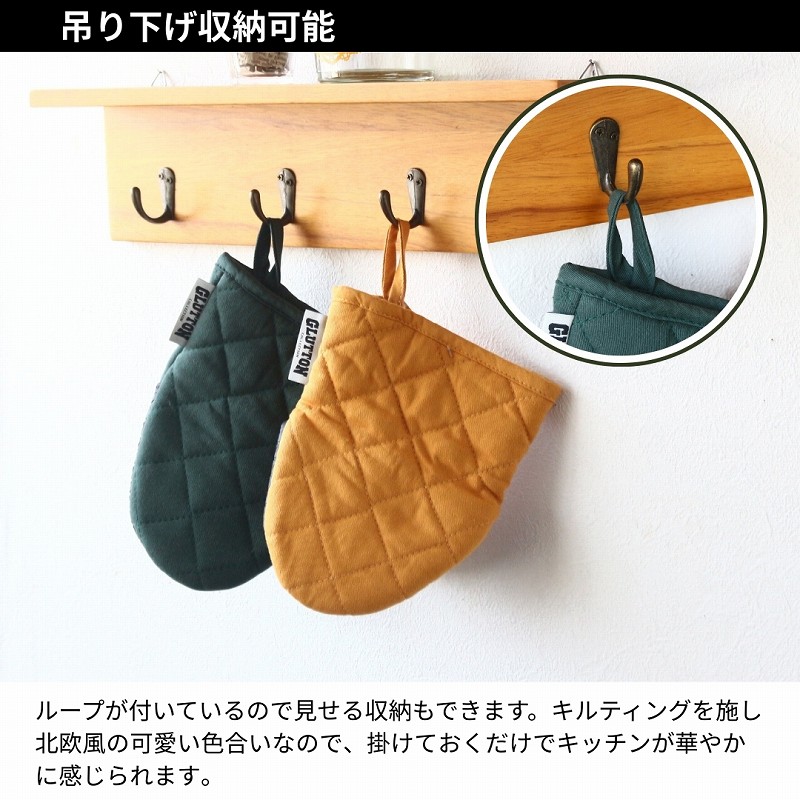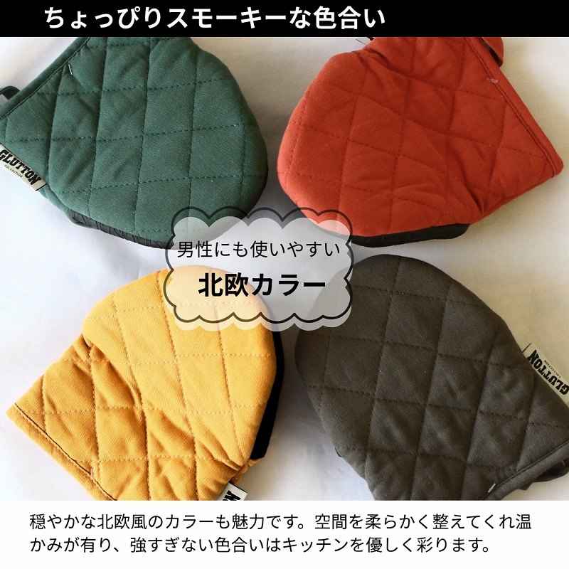 | ちょっと短めがちょうどイイ。ショートサイズのかわいい鍋つかみ! ショート丈なので着脱が容易です。スパッとはめることが出来、着脱がスムーズ!またコンパクトサイズなので手にフィットしやすく、お鍋やグラタン皿等持ち運びも安心! 収納時もコンパクトサイズの為かさばらず◎ ちょっぴりスモーキーな穏やかな北欧風のカラーも魅力です。空間を柔らかく整えてくれる温かみが有り、強すぎない色合いはキッチンを優しく彩ります。 ループが付いており吊り下げ収納も出来ます。 こちらの商品は片手用(1点)の販売です。 |
