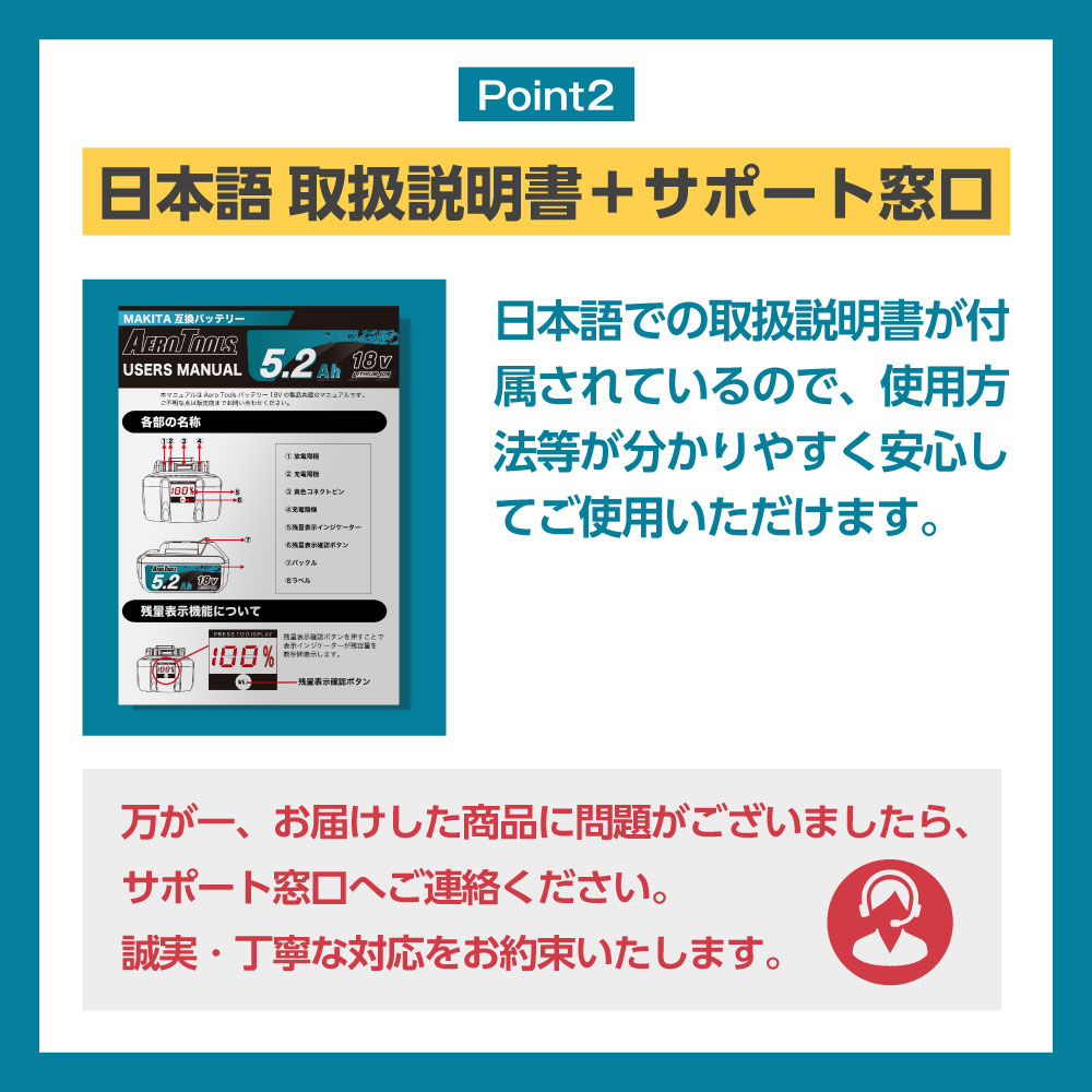 | 商品説明 | 洗車ブロワーで話題の『AERO TOOLS(エアロツールズ)』より、マキタ互換バッテリーが登場しました。 日本の会社が安全性や品質にこだわって企画し、正規のPSEの届け出を自社で行い、ISO9001認証の信頼できる中国工場にて生産しています。 12ヶ月の長期保証は製品への自信の証。 マキタ純正の電動工具はもちろん、草刈機、掃除機、集塵機、ブロアー、空気入れなど18Vの機種には全て対応しており、問題なくご使用いただけます。 DC18RC、DC18RF、DC18RAなどの純正バッテリー充電器での充電も可能です。 |