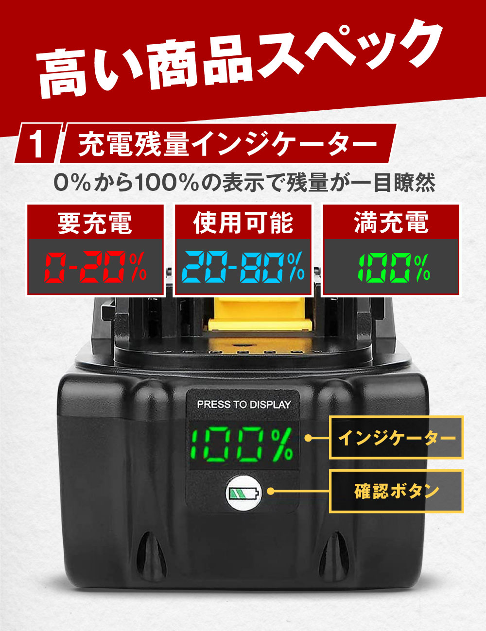 | 製品仕様 | %充電残量表示機能 |