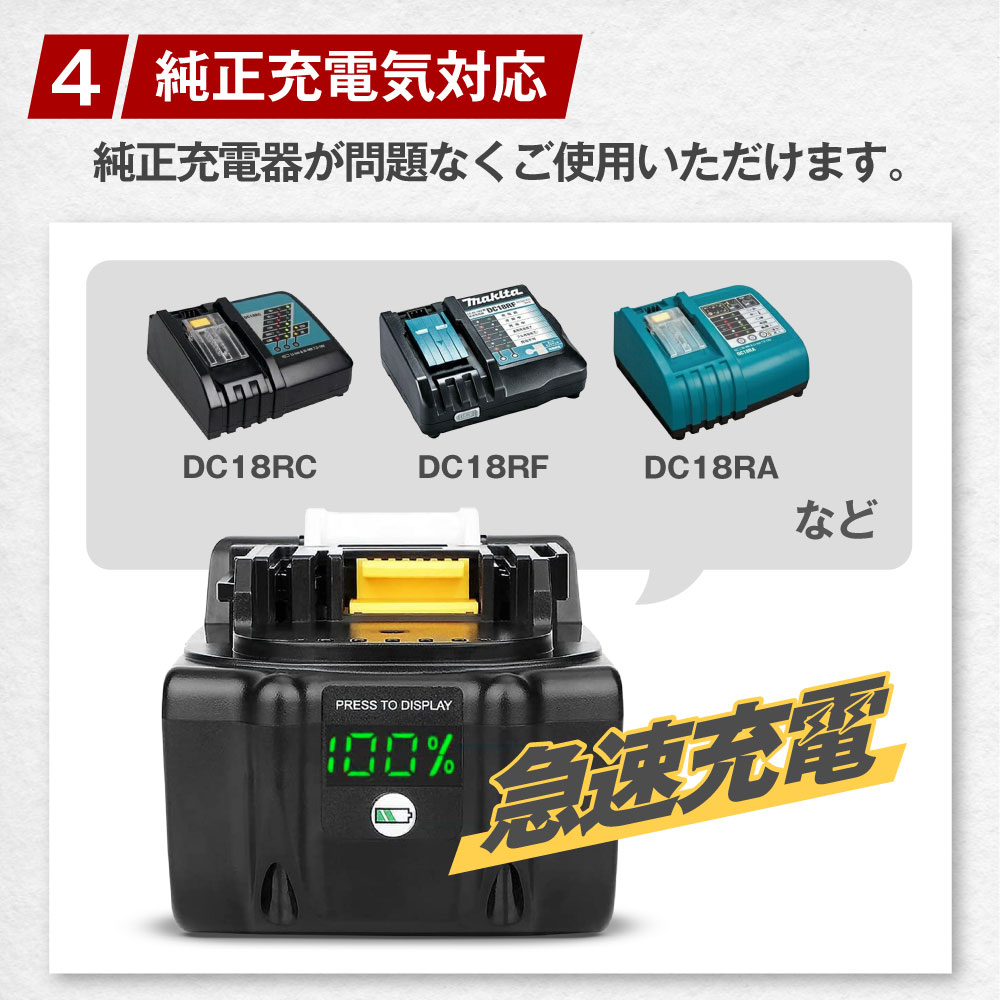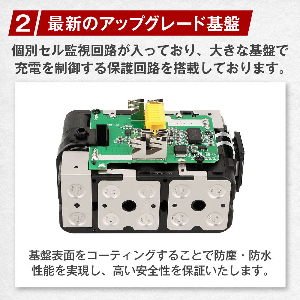 | 商品特徴 | ■保証について 12ヶ月の長期保証は製品への自信の証。 製造物責任保険でカバーされているので、万が一の不具合等にもお客様窓口にて対応いたします。 安価な粗悪品で苦労されている方にオススメです。 ■機能と安全性 視認性の高いパーセンテージでの充電残量表示機能を搭載。 個別セル監視回路が入り、大きな基盤で充電を制御する保護回路を搭載。 基板表面のコーティングで防塵防水性能に優れています。 ■マキタの同電圧全機種に対応 マキタ純正の電動工具はもちろん、草刈機、掃除機、集塵機、ブロアー、空気入れなど18Vの機種には全て対応しており、問題なくご使用いただけます。 ■純正充電器でフルスピード充電 DC18RC、DC18RF、DC18RAなどの純正バッテリー充電器での充電も可能です。 バッテリー搭載のメモリチップが使用履歴を記憶し、充電時にこの履歴をデジタル通信で充電器に送ることで、バッテリの状態(高温、満充電後の再充電、過放電など)を判断して、最適な方法と時間で充電します。 また、急速充電機能付きの充電器ににも対応しています。 |