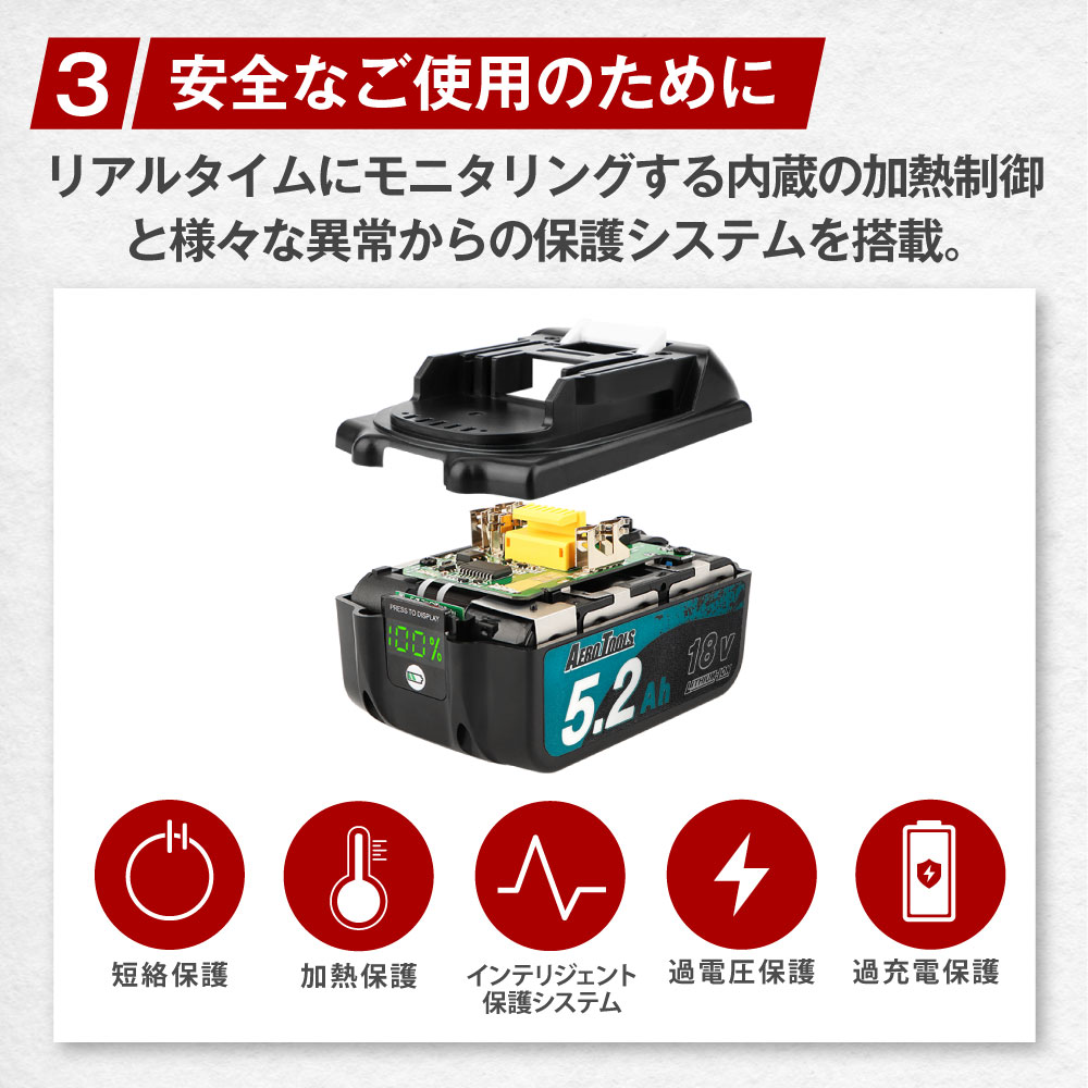 | 商品名 | AERO TOOLS 互換バッテリー MAKITA 互換 LAB 18V 5.2Ah |