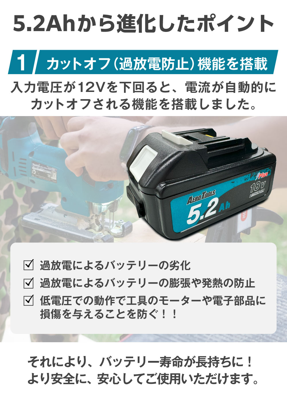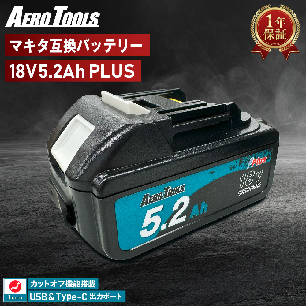 | 商品名 | AERO TOOLS マキタ互換バッテリー5.2Ah Plus |