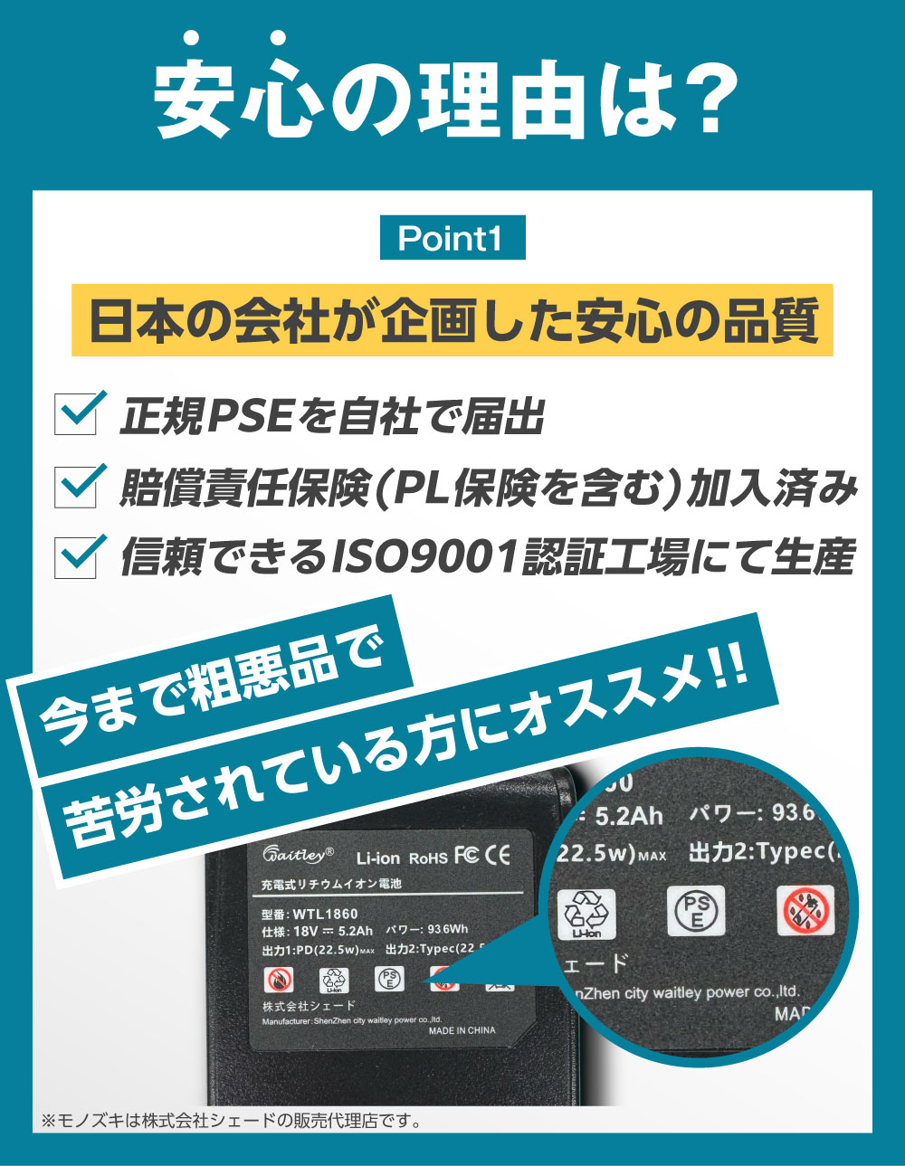 | 商品特徴 | ■保証について 12ヶ月の長期保証は製品への自信の証。 製造物責任保険でカバーされているので、万が一の不具合等にもお客様窓口にて対応いたします。 安価な粗悪品で苦労されている方にオススメです。 ■カットオフ(過放電防止)機能を搭載 入力電圧が12Vを下回ると電流がカットオフされる機能を搭載しました。 これにより、『過放電によるバッテリーの劣化を防ぐことによるバッテリー寿命の伸び』『過放電によるバッテリーの膨張や発熱の防止』『適切な電圧で動作を停止することで、低電圧での動作で工具のモーターや電子部品に損傷を与えることを防ぐ』などの効果があります。 ■USB QC3.0&PD(Type-C)出力ポートでモバイルバッテリー代わりに マキタ互換バッテリーから直接スマホやイヤフォン、その他電子機器を充電できるポートを実装しました。 22.5Wの急速充電に対応しているので、現場や出先での急なバッテリー切れにも素早く充電ができます。 108Whの大容量モバイルバッテリーとして、地震などの災害時にも心強い装備になります。 ■実容量5200mAh 5.2Ah PLUSはサンパワー社製の2500mAhセルを採用により、リアルな実容量5.2Ahを実現しました。 5つのLEDランプで正確なバッテリー残量を表示。 パワフルかつ長持ちする高品質バッテリーとして、一般ユーザーのDIY用途はもちろん、プロの職人さんの現場での使用にも充分に耐える製品になりました。 ■もちろんPSE認証済み 「特定電気用品以外の電気用品」のPSE適合基準に基づいた生産、製品管理を行っていることを経済産業省に届け出ています。 PSE認証は日本国内に電気用品を輸入する事業者自身が届け出る必要があり、シェードでは全てのPSE認証が必要な製品について適合検査と届け出を行っています。 ■PL保険加入済みで万一の場合も手厚くサポート メーカーがPL保険(生産物賠償責任保険)に加入しているため、製品の初期不良などはもちろんのこと、万が一製品に起因する事故が起きてしまった場合でも必ず責任を持って対応いたします。 ■日本語説明書付き 海外業者の販売する互換バッテリーとは違い、日本語の製品マニュアルを同梱しています。 ■マキタの同電圧全機種に対応 マキタ純正の電動工具はもちろん、草刈機、掃除機、集塵機、ブロアー、空気入れなど18Vの機種には全て対応しており、問題なくご使用いただけます。 ■マキタ純正充電器で充電可能 DC18RC、DC18RF、DC18RAなどの純正バッテリー充電器での充電が可能です。 |