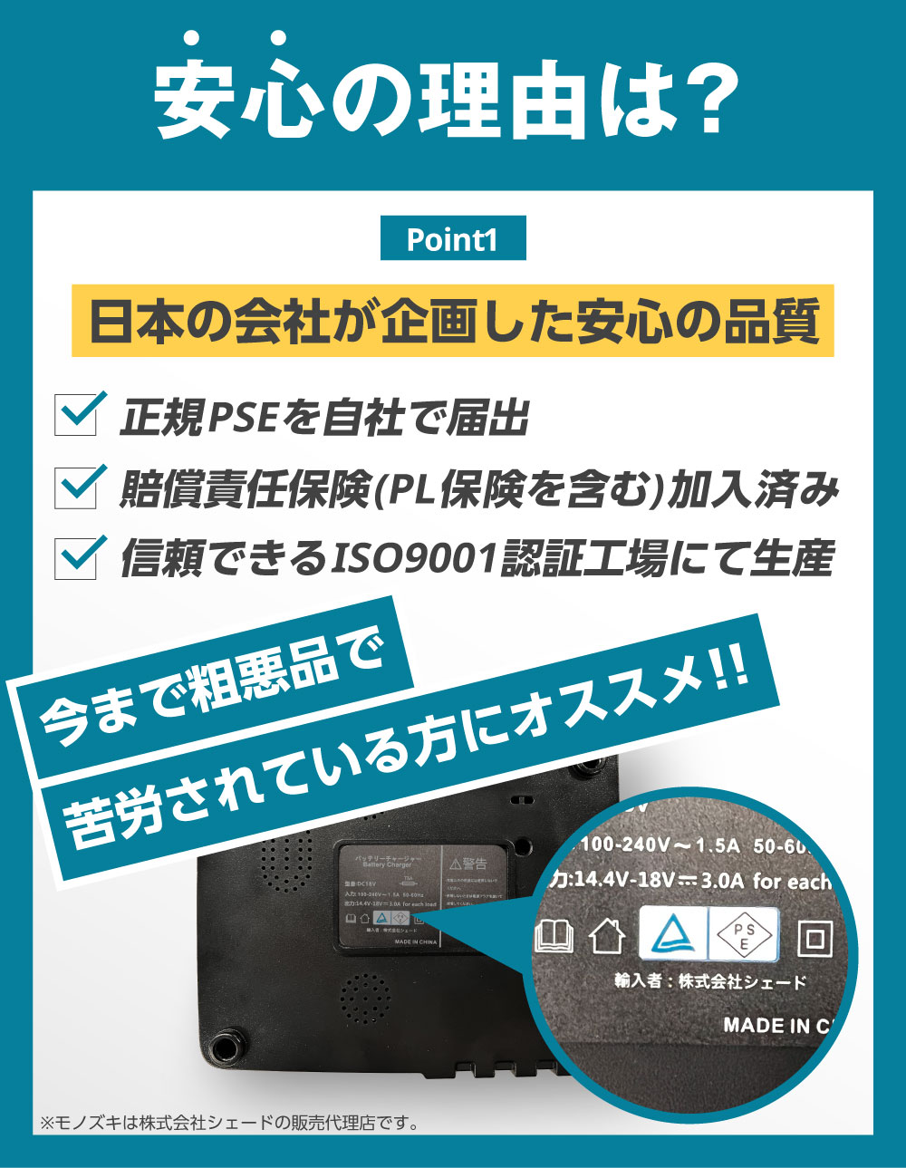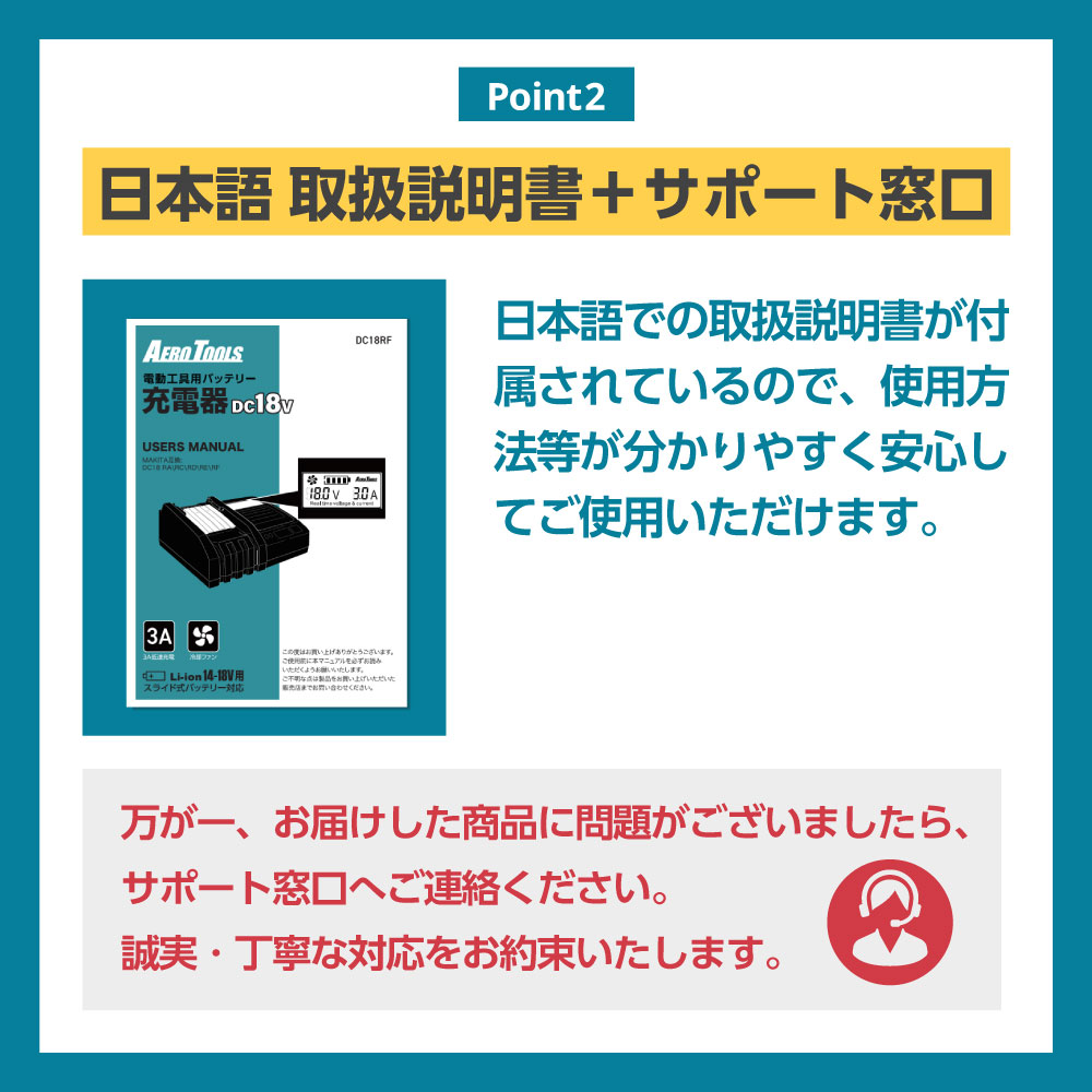 | 商品説明 | 大人気ブランド「AERO TOOLS」より、待望のマキタ互換充電器が登場しました! 日本の会社が安全性や品質にこだわって企画し、正規のPSEの届け出を自社で行い、ISO9001認証の信頼できる中国工場にて生産している充電器です 株式会社シェードが責任を持ってPSE認証の届け出を行っておりますので、互換充電器や互換バッテリーを使うのが初めてで不安という方にも安心してお使いいただけます。 |