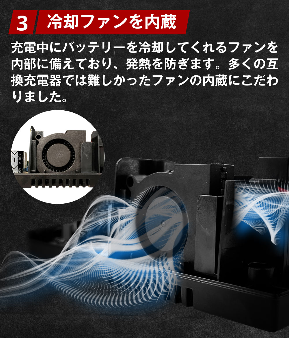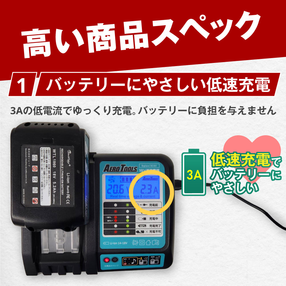 | 商品特徴 | ■安心のWaitley社製なので、1年保証付き 製造を担当しているのは互換バッテリーで高い評価を受けているWaitley社です。 12ヶ月の長期保証は製品への自信の証。 製造物責任保険でカバーされているので、万が一の不具合等にもお客様窓口にて対応いたします。安価な粗悪品で苦労されている方にオススメです。 ■あんしんの低速充電 通常の充電よりもゆっくりと充電を行うので、バッテリーに負担をかけません。 特に互換バッテリーを急速充電器で充電するのは危険とされているので、互換バッテリーには互換充電器をオススメいたします。 冷却ファンも備え、内部構造はヒートシンク構造と、徹底的に「安全」「あんしん」にこだわりました。 ※純正充電器よりも満充電までに時間がかかることはご承知ください。 ■充電状況がひと目でわかる液晶ディスプレイ 大きな液晶ディスプレイを備えているので充電の状況がひと目でわかります。 充電開始時、完了時には音楽も流れるので、使いやすくなっております。 また、充電状況をリアルタイムでモニタリングしてくれます! バックライトが青色だから見やすいのも嬉しいポイント◎ ■対応バッテリー 14.4v~18v対応。 互換LAB MKT 互換バッテリー 6Ah 9Ah 6.0 9.0 BL1415 BL1430 BL1440 BL1450 BL1460BL1815 BL1830 BL1840 BL1850 BL1860など |