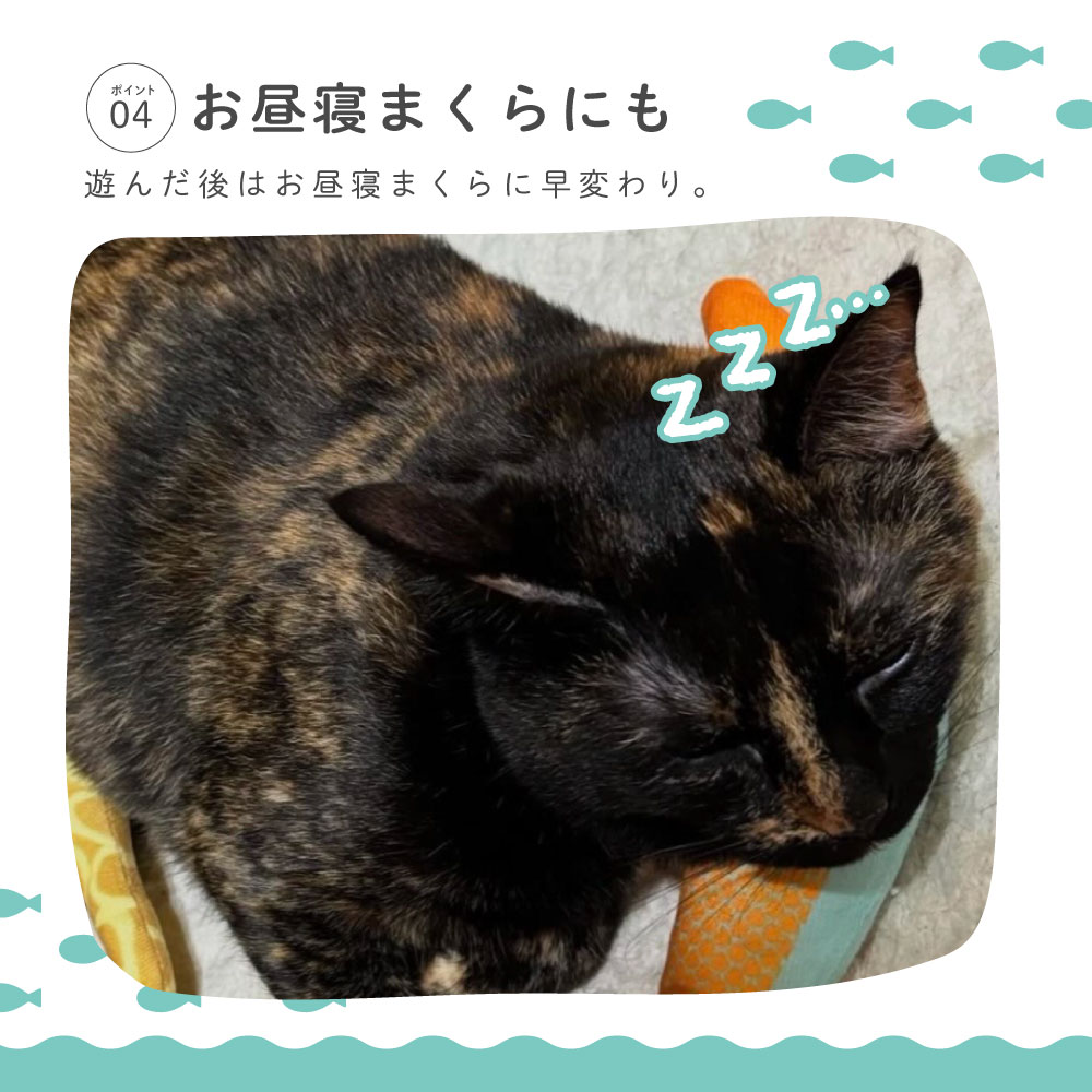 ■遊んだ後はまくら代わりにちょうどいい柔らかさなので猫ちゃんも抱えたままぐっすり。やみつきになるぬいぐるみです。